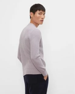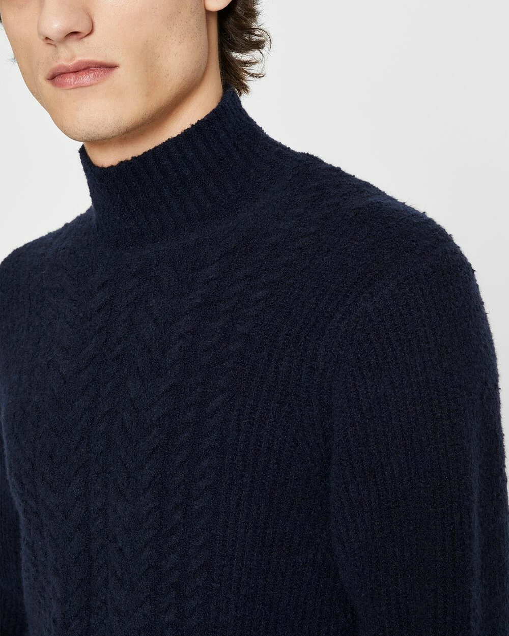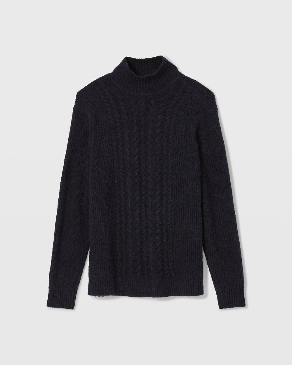 A richly textured mock-neck sweater is distinguished by cable-knit stitchwork at the center. Made from a cool cotton blend with comfortable stretch and a straight fit.