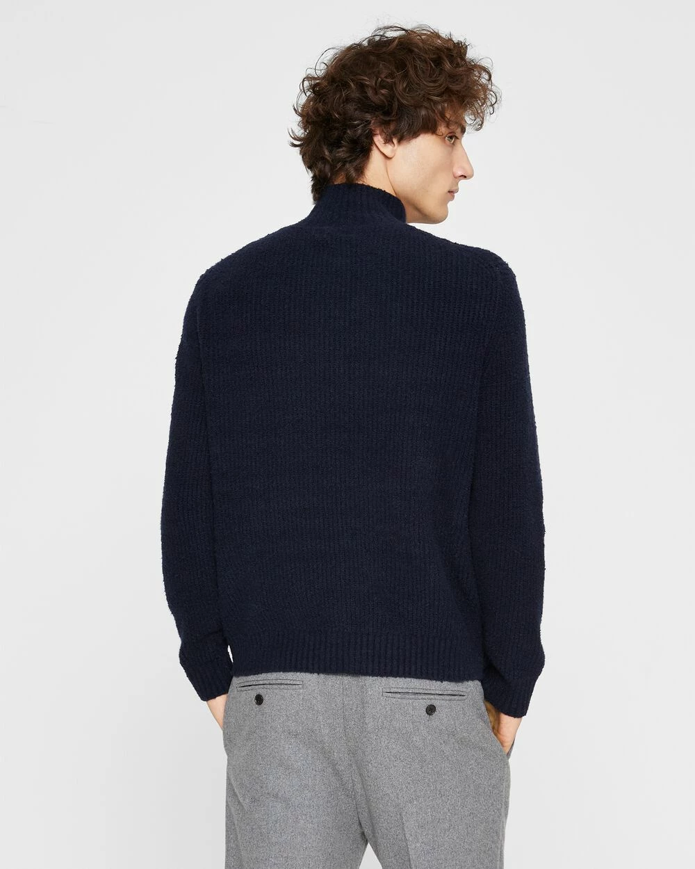 - Rib-knit mock neck, cuffs, and hem; long sleeves