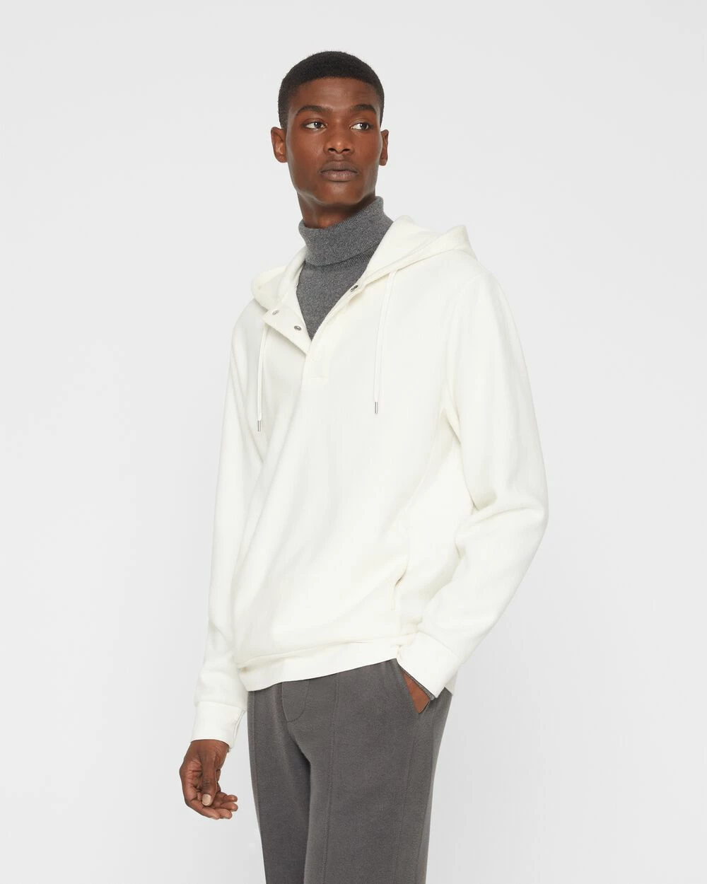 This one’s different. We brushed a cotton-blend fabric to give it the softest possible feel, then combined it with a laid-back hoodie silhouette with a snap placket for added interest. Extra soft and super comfortable, this transitional hoodie really takes the off-duty staple to an elevated place.