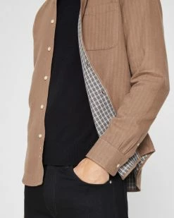 A hint of what’s to come. A contrast pattern on the reverse side peeks through the front of our sturdy doublefaced dress shirt. A customer favorite, back in fall-friendly colors and tailored for a slim fit in a cool cotton blend.