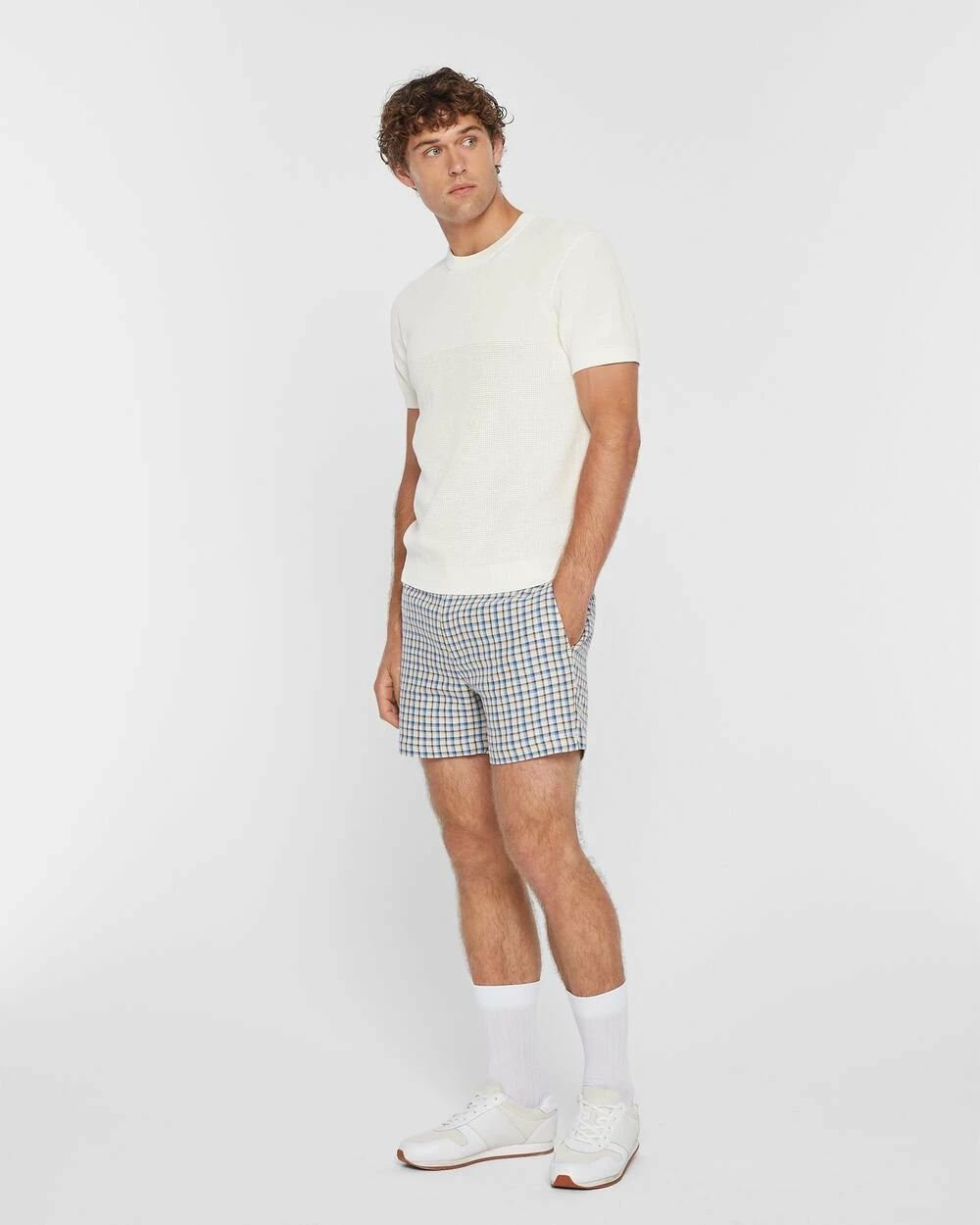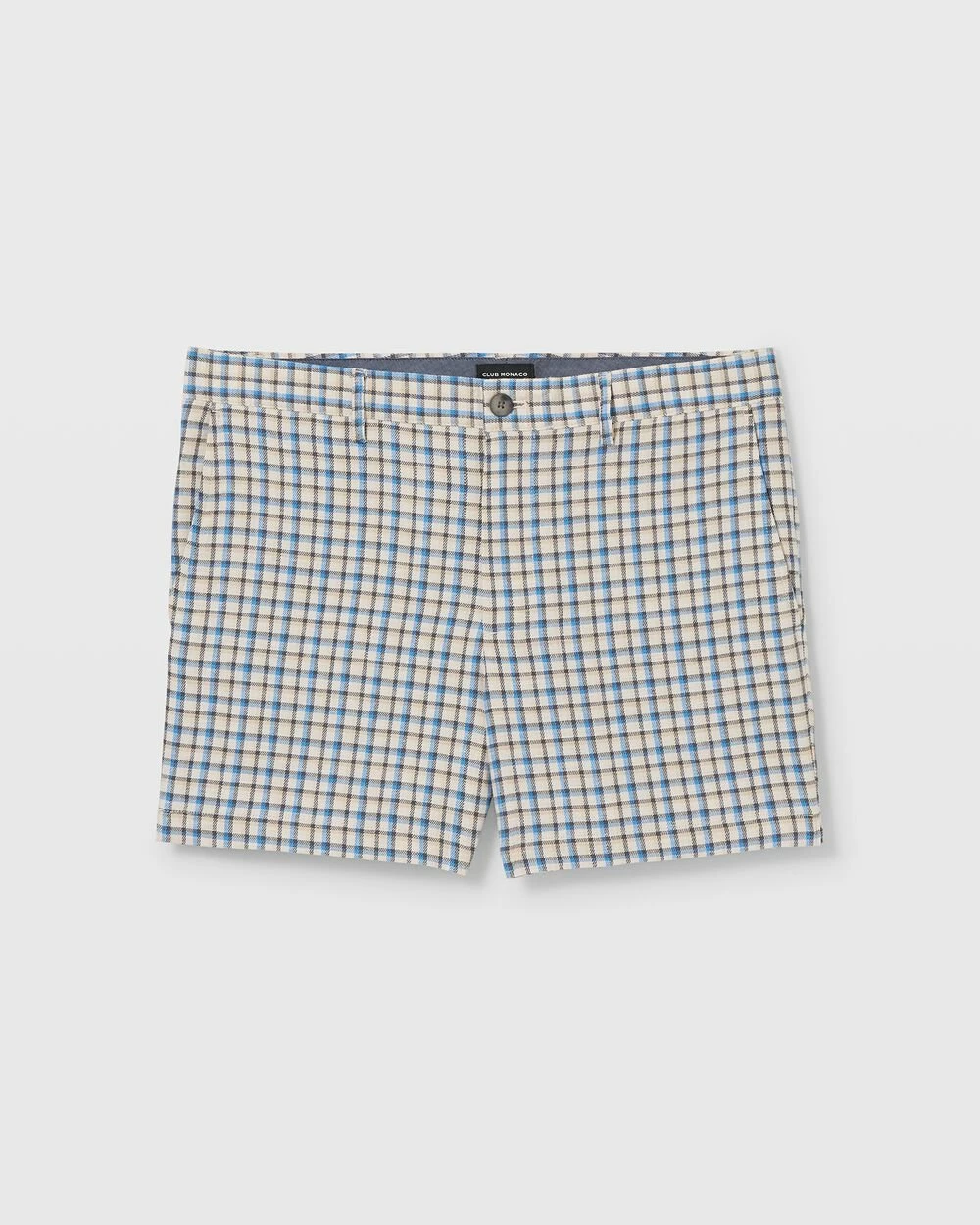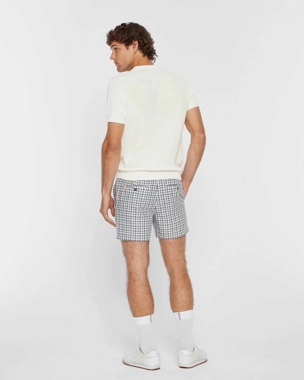 A favorite. The shortest of our essential fits, here in a checkered linen blend. With a tailored design and a modern 5-inch inseam.