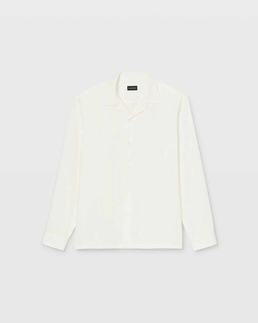 - Camp collar; long sleeves with single-button barrel cuffs; back shoulder yoke; straight hem with side-seam slits