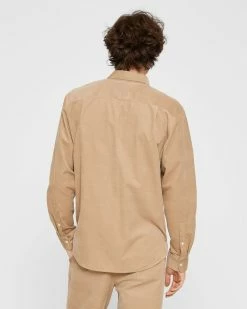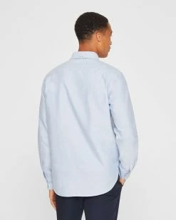 - Spread collar; two chest pockets; long sleeves; single-button barrel cuffs; shoulder yoke with two single pleats at back; shirttail hem