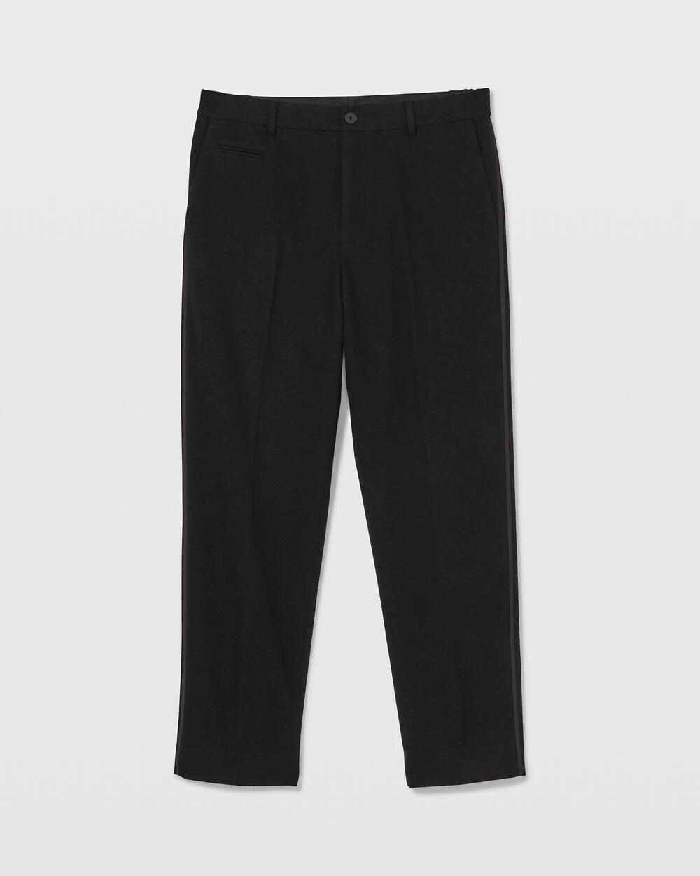- Set-on waistband; belt loops; flat front; one coin pocket; two side pockets; two back pockets