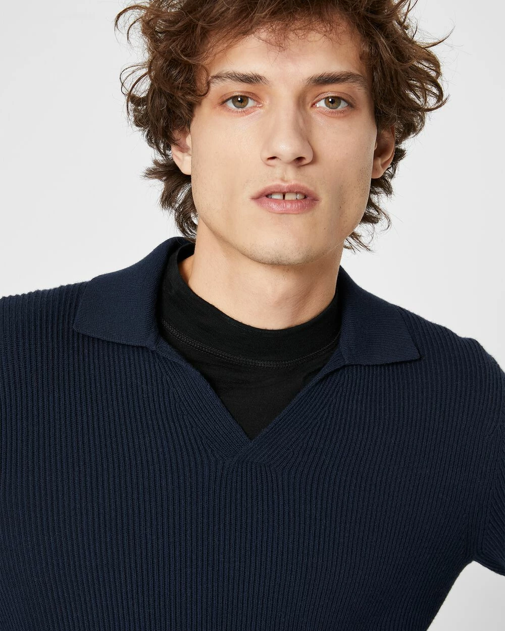 An easy-fitting sweater with a clean-lined Johnny collar and vertical ribbing offers polished versatility. Wear under blazers for a fresh take on weekday dressing.
