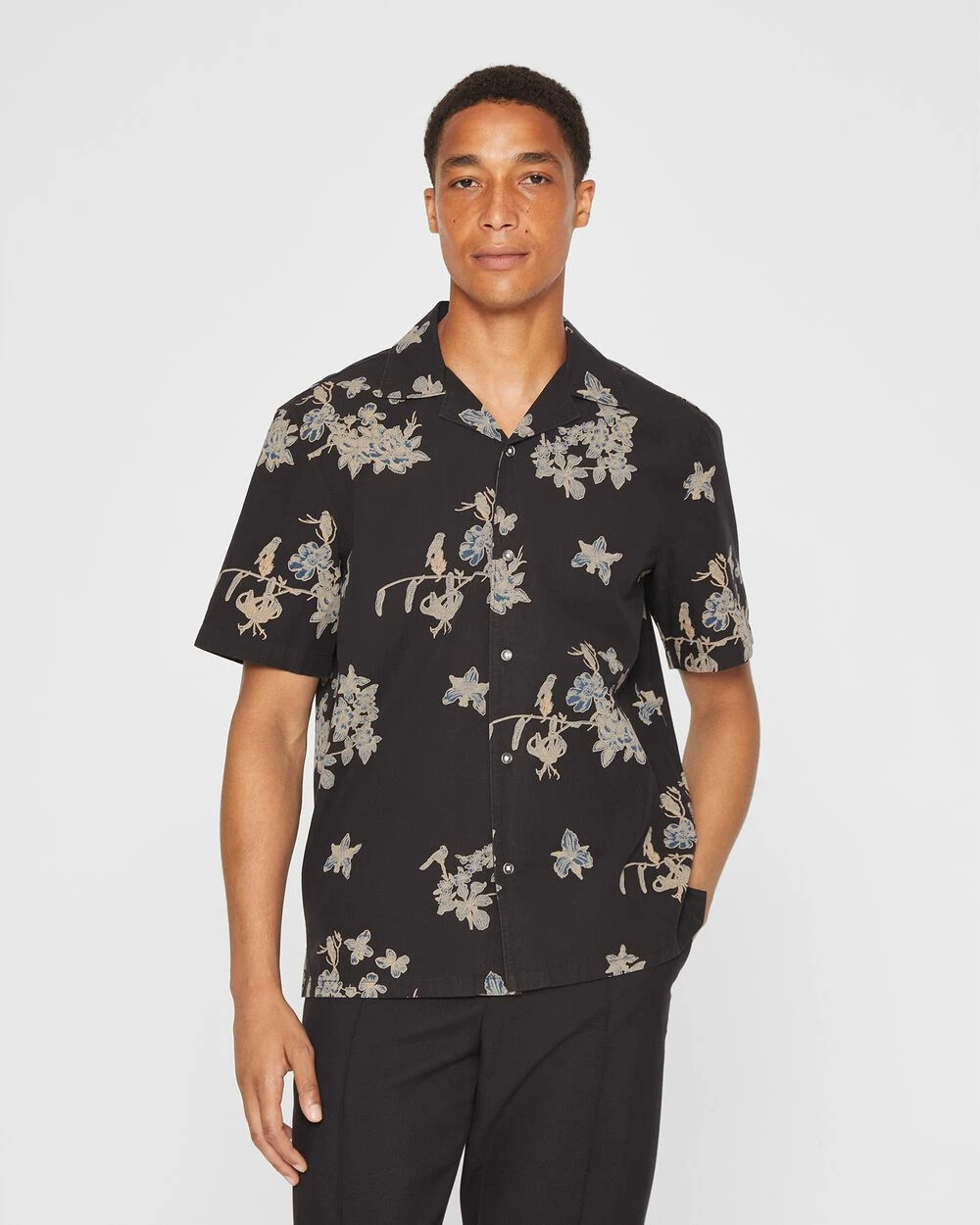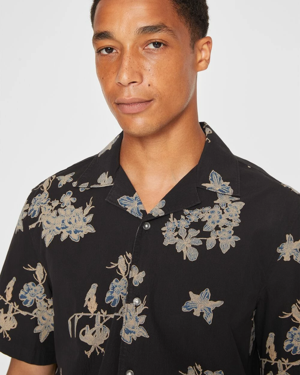 A relaxed button-down shirt with a crisp camp collar and wide, short sleeves. Made from a soft cotton blend with just the right amount of stretch and finished with a floral toile print.