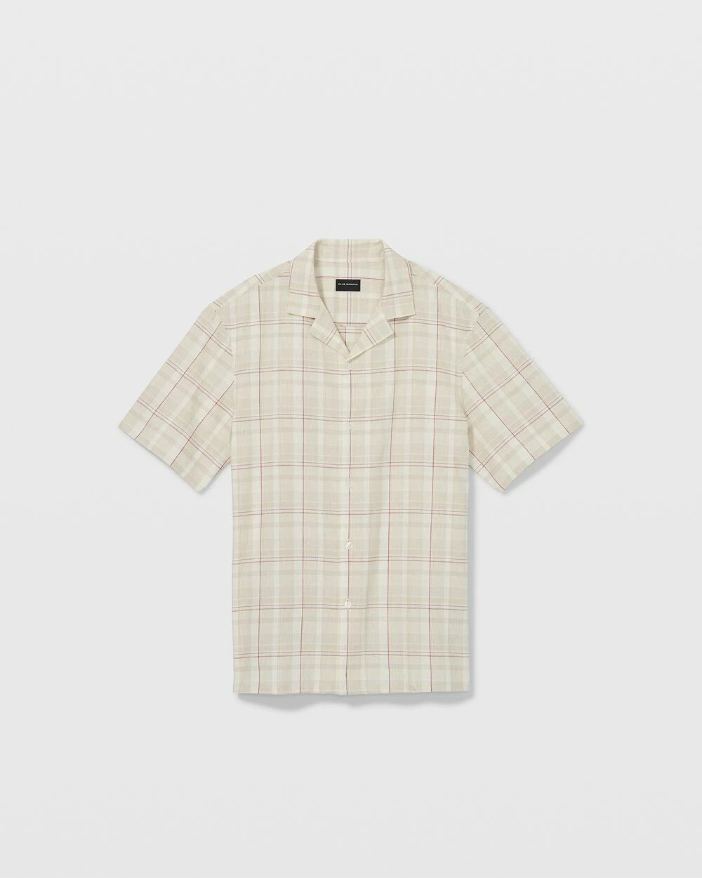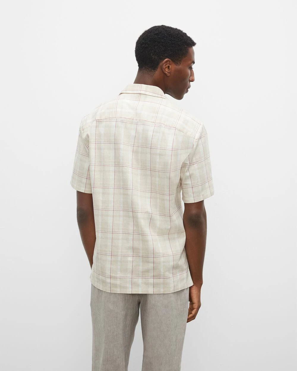 Keep it light. A slim-fit button-down shirt made for warmer days, with short sleeves and a breathable linen blend with just the right amount of stretch. Styled with a camp collar for a casual finish.