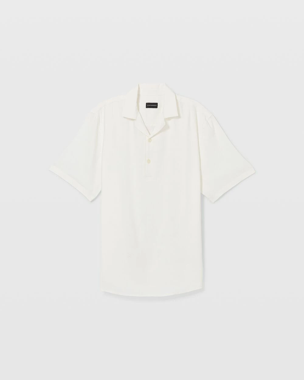 - Camp collar; short sleeves; shoulder yoke and two single pleats at back; shirttail hem with side-seam slits
