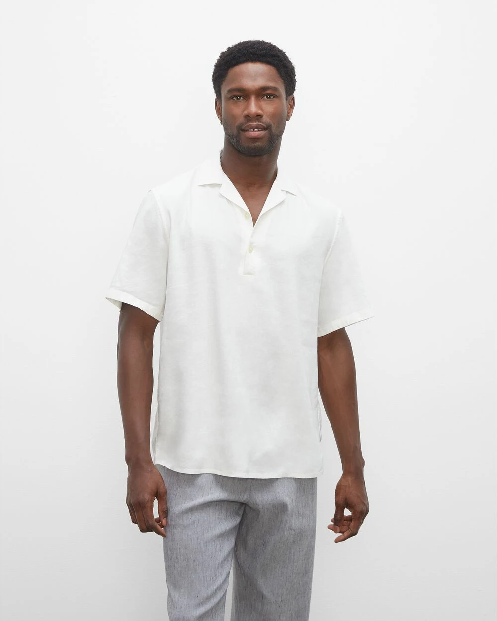 Cut slim through the body for a close fit, this camp-collar shirt offers the perfect balance between sporty and refined. This easy popover style is crafted of a breathable linen-blend fabric, with a comfortable amount of stretch.