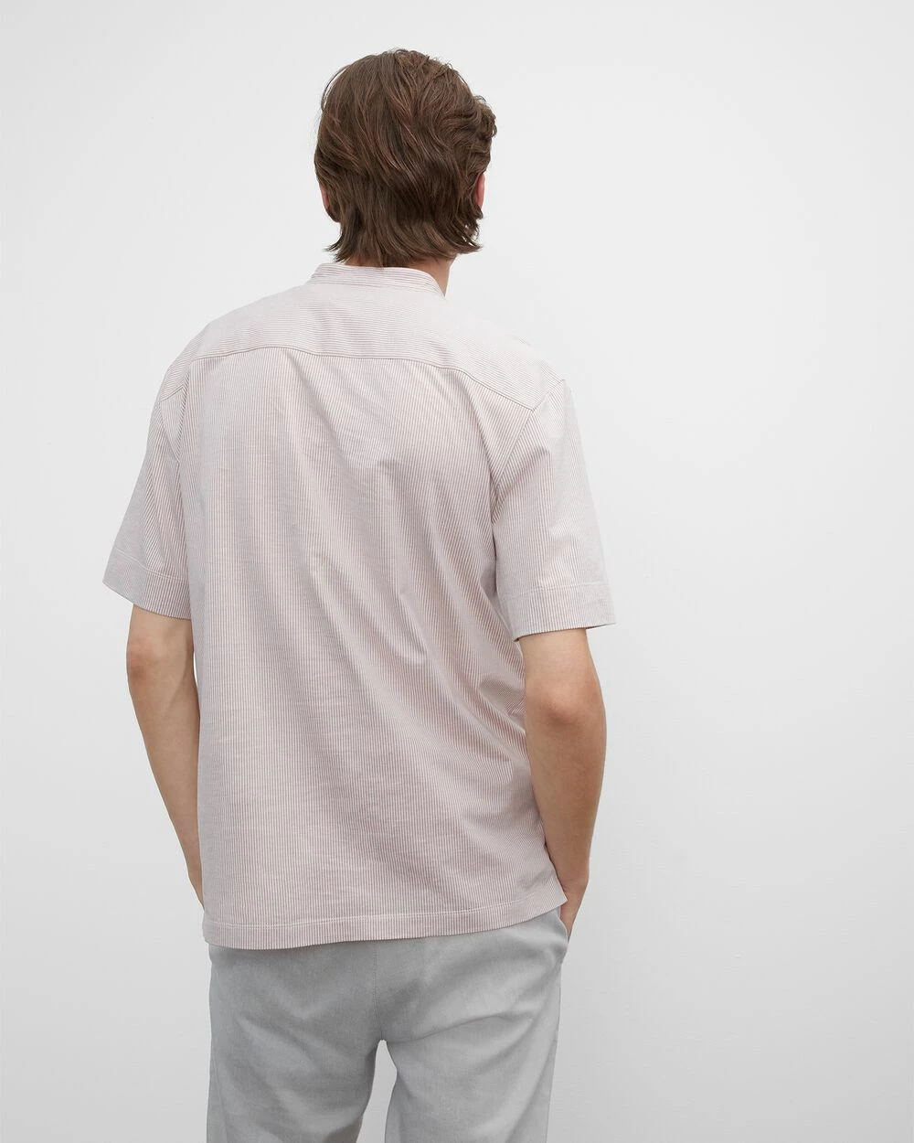 - Band collar; one chest pocket; short sleeves; back shoulder yoke; straight hem with side-seam slits