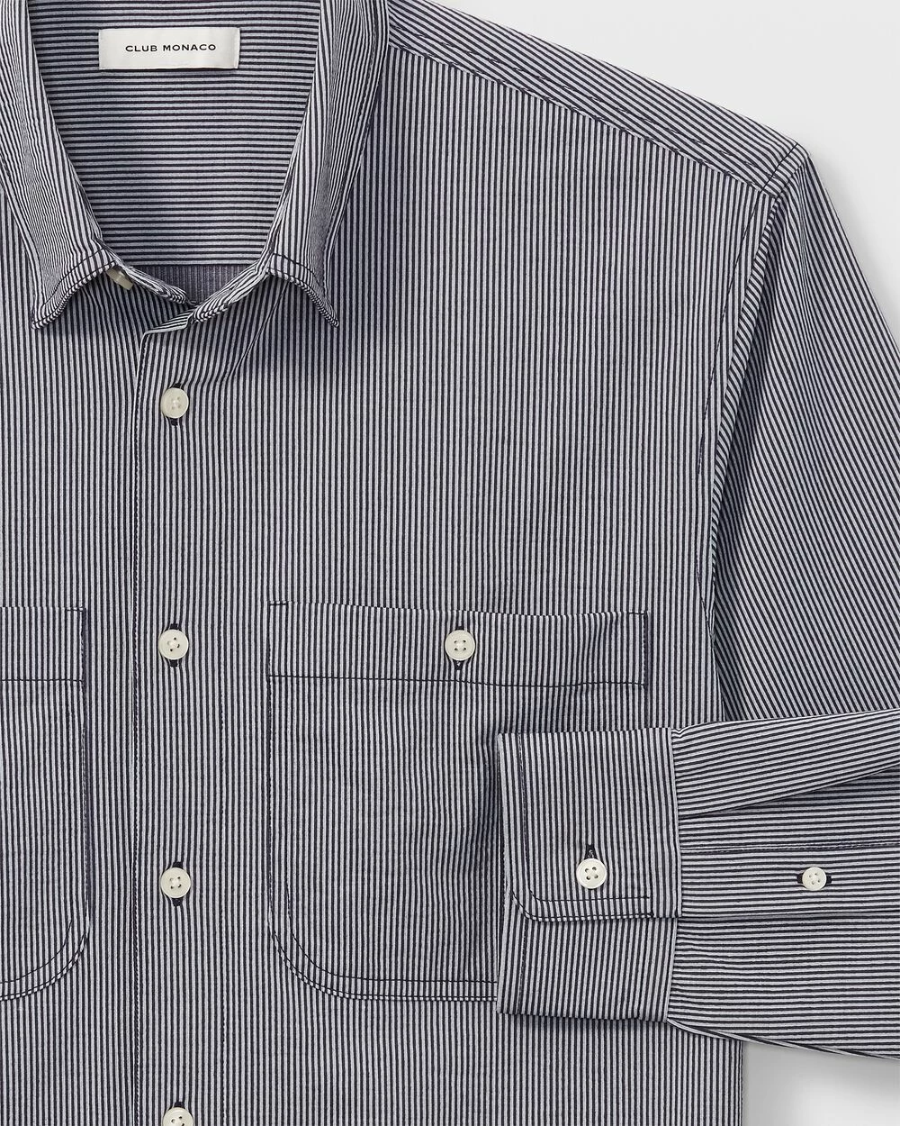 - In a fine stripe pattern, our reinterpretation of uniform dressing