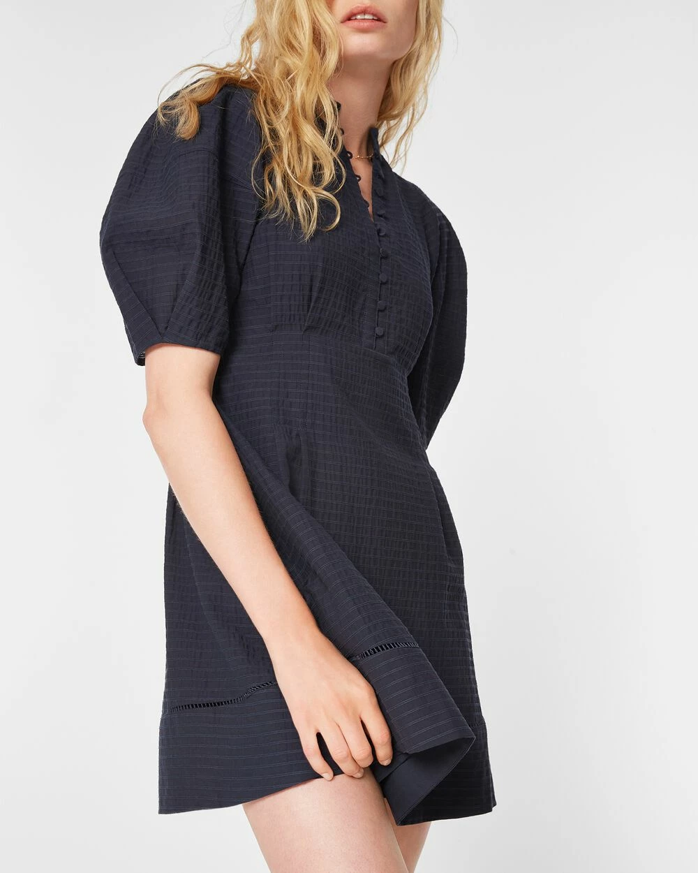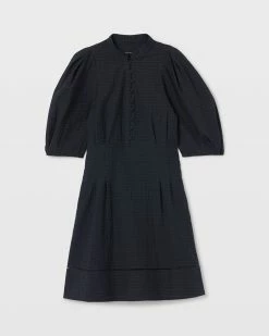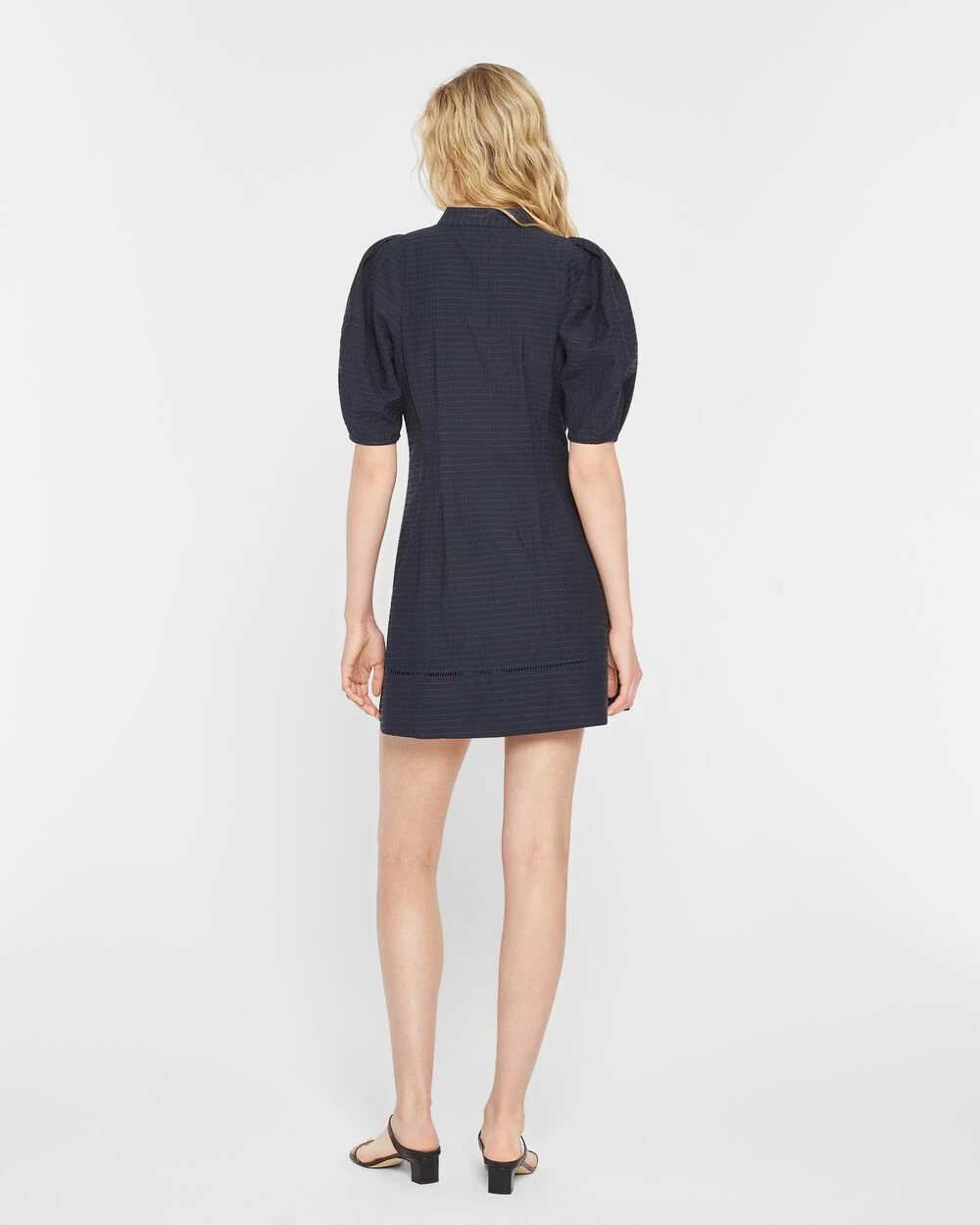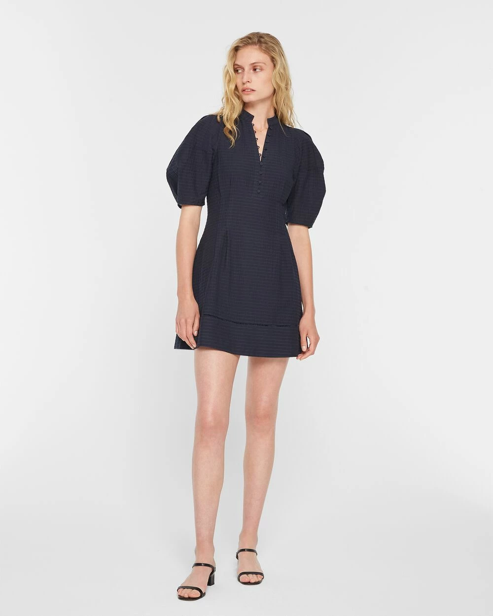 This A-line minidress hits all the modern marks with sculptured balloon sleeves, pretty button-and-loop detail, and intricate hem stitching. In a tonal-striped cotton blend for comfort and easy elegance. Made with recycled polyester. By turning industrial waste and post-consumer waste into new product, we are repurposing plastic and reducing our dependence on virgin petroleum-based materials.