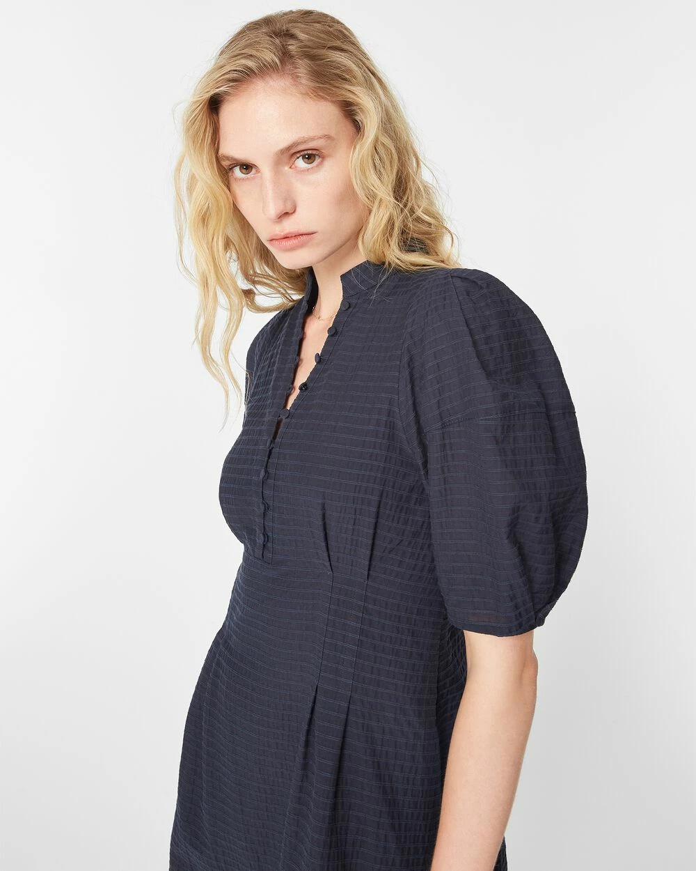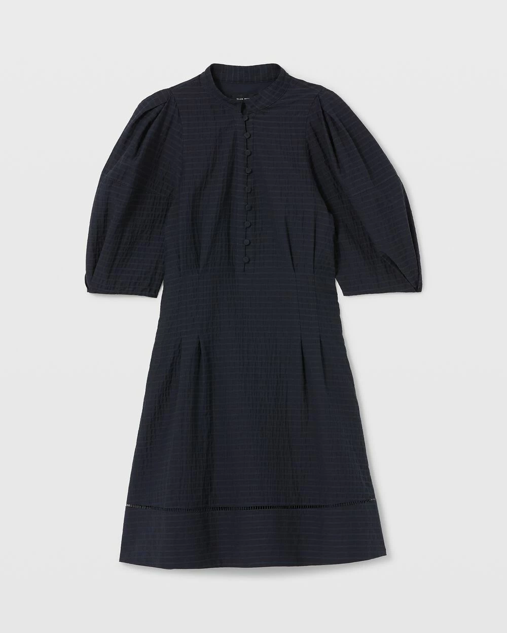 - Stand collar; short balloon sleeves; vertical darting at waist and back; ladder-stitched detail at hem