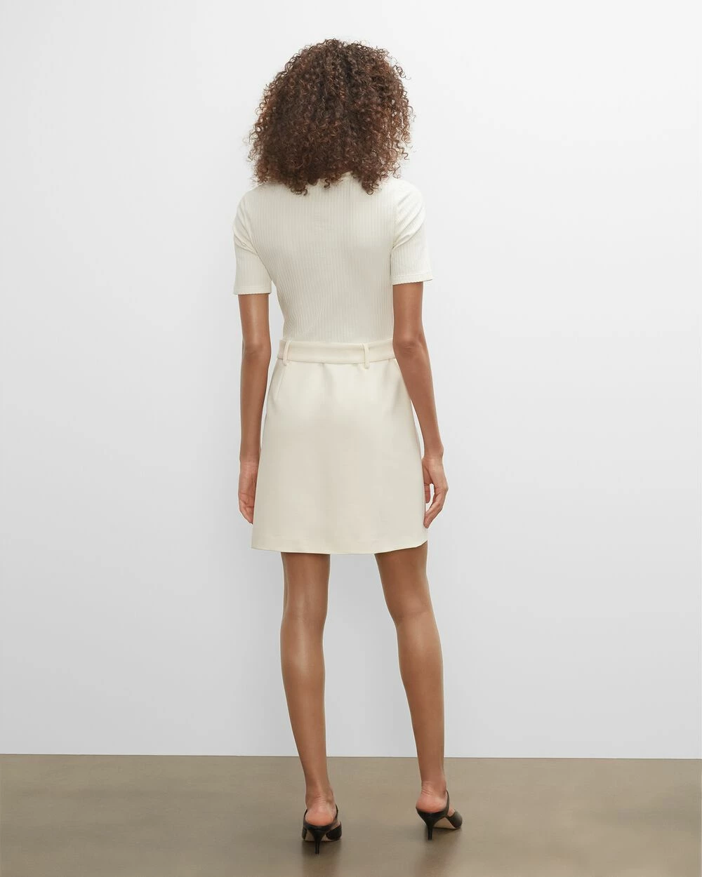 We took the mini dress to a more elevated place with a clean A-line silhouette and a self-belt for your most flattering fit. With a ribbed bodice and a crepe skirt, this dress is adaptable enough to take you from the office to afterhours in a cinch. Made with recycled polyester. By turning industrial waste and post-consumer waste into new product, we are repurposing plastic and reducing our dependence on virgin petroleum-based materials.