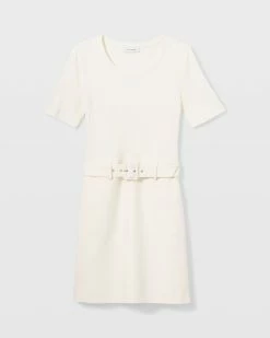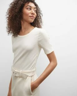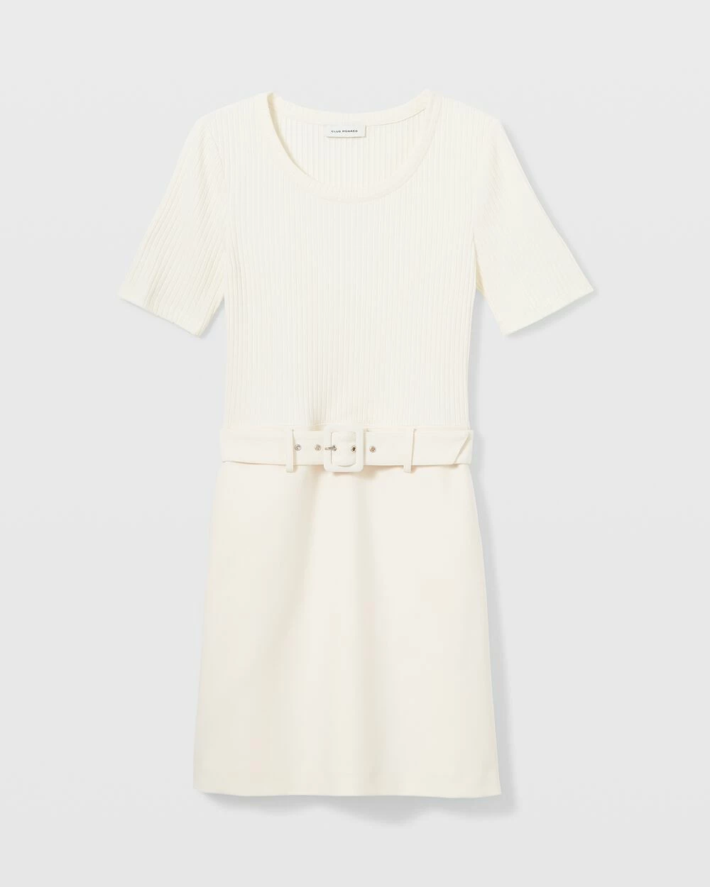 - Scoop neck; short sleeves; ribbed bodice; belted waist; two side pockets; crepe skirt