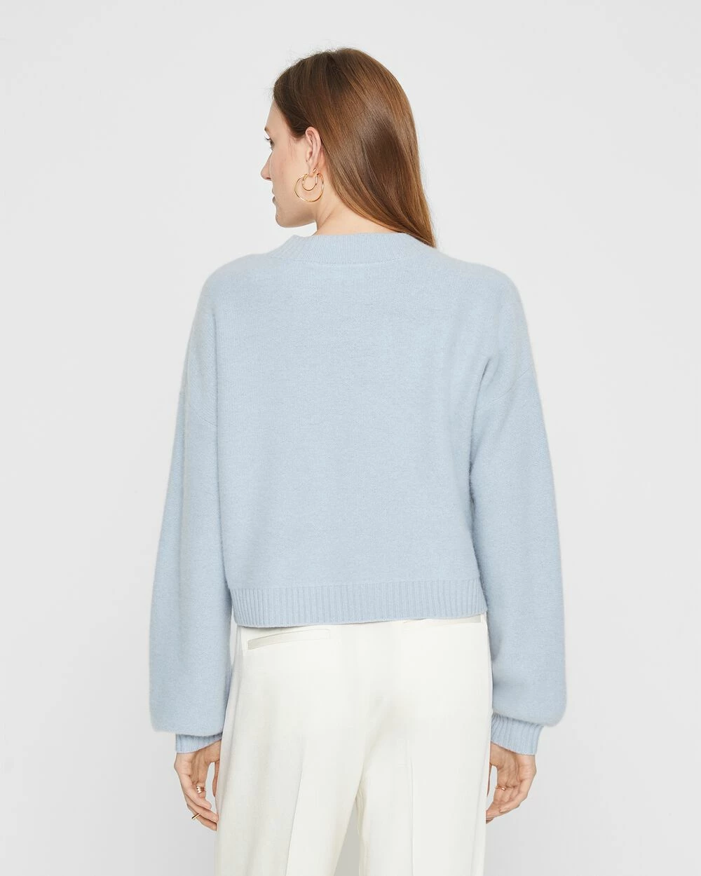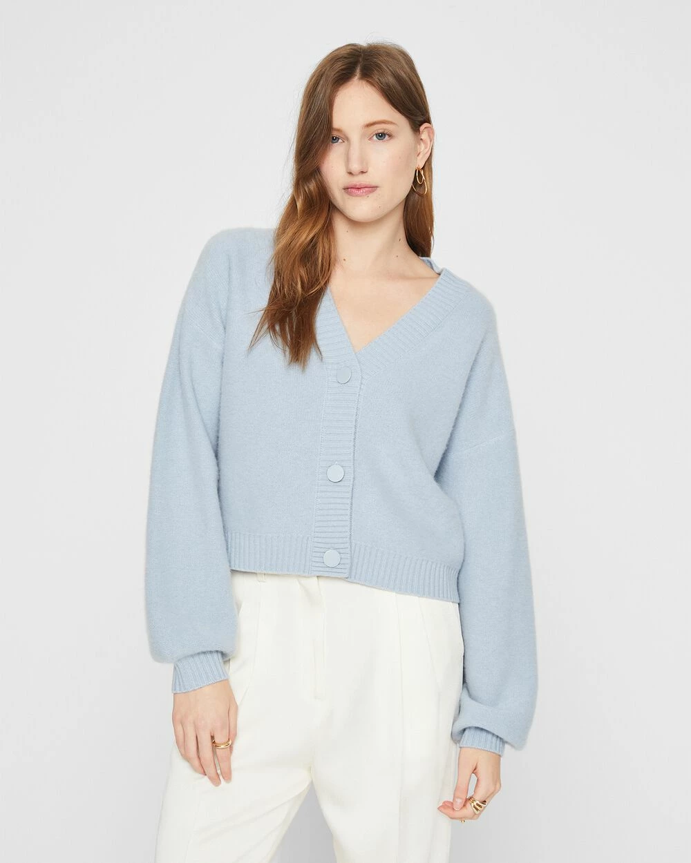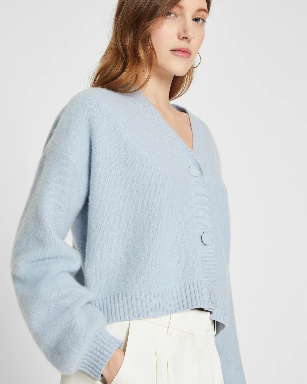 A new crop is in order. A slouchy, drop-shoulder cardigan is updated with a shorter hem and pure cashmere for a luxe feel.