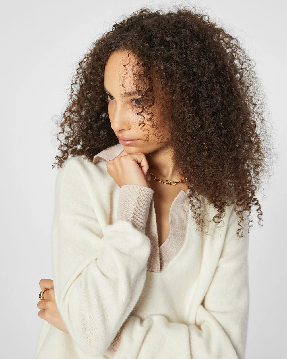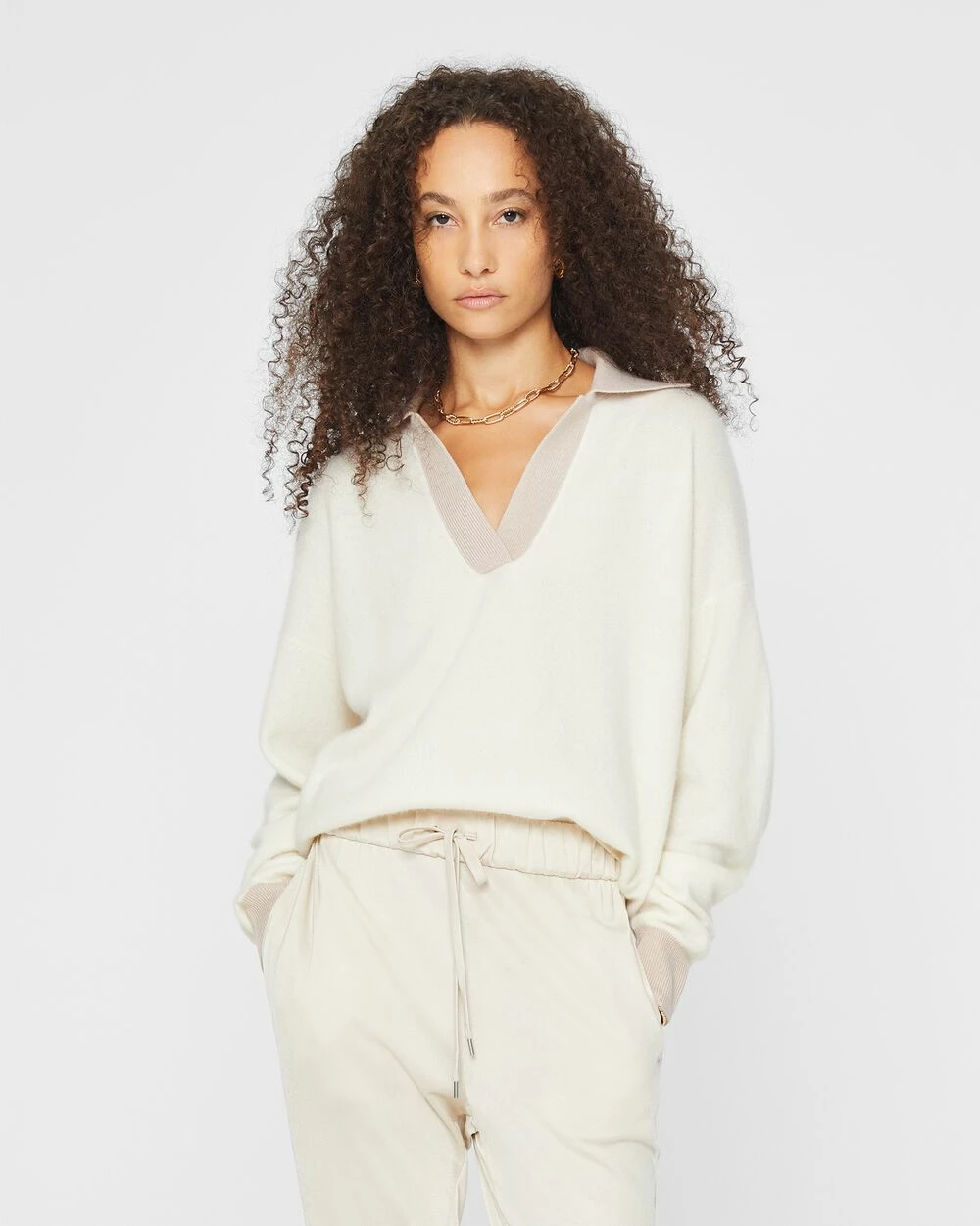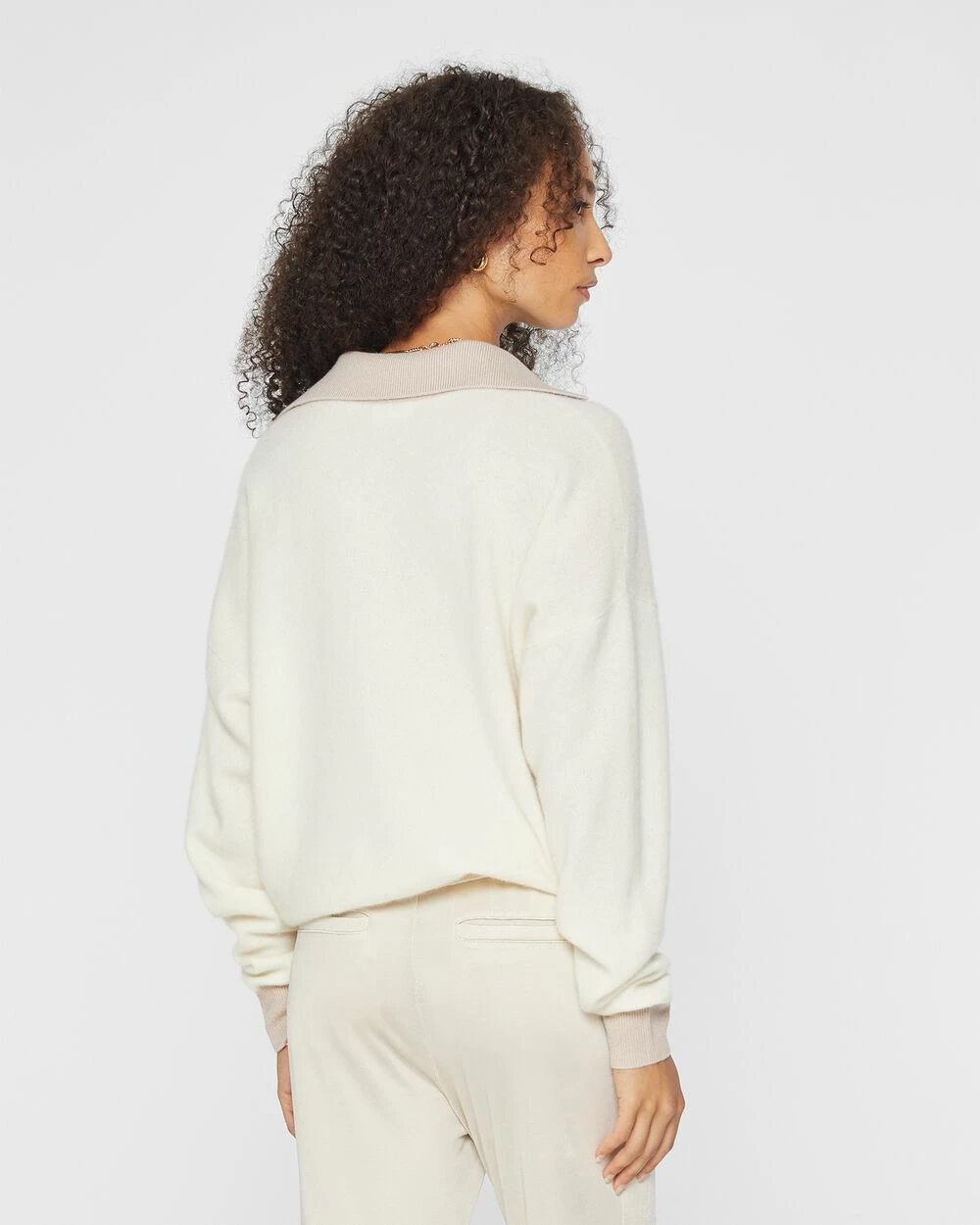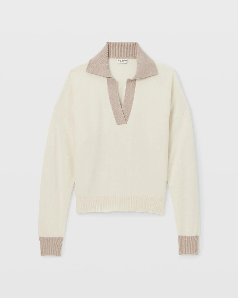 Speaking softly. A boiled cashmere sweater borrows a sporty collar from the classic polo shirt and offsets it with a relaxed silhouette and dolman sleeves. For working, entertaining, or just relaxing.