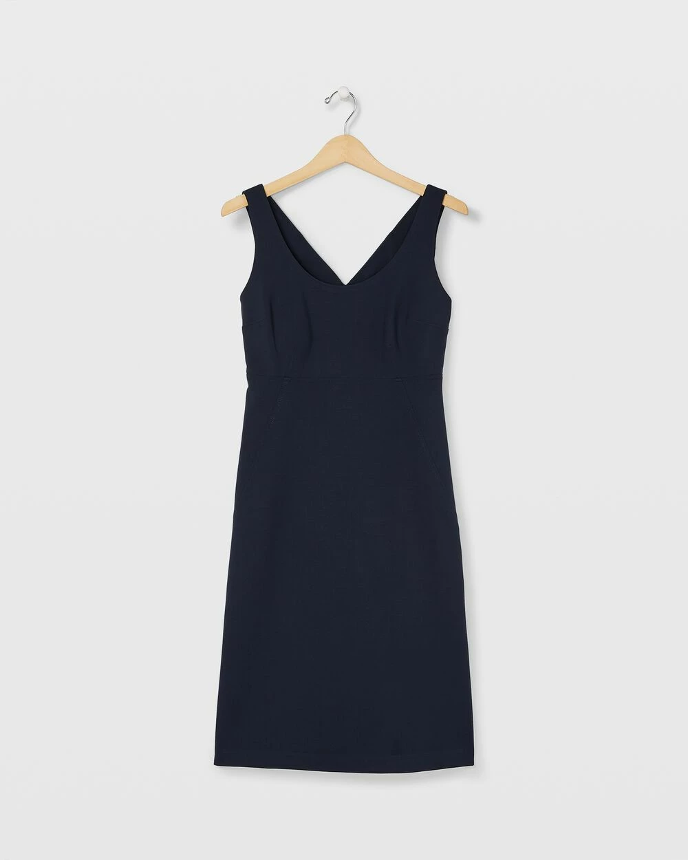 - Scoop neckline at front; V-neckline at back; concealed back zipper with hook-and-eye closure; darts at bodice and waist; seamed details at front and back hips; vent at center back hem with resin button closures