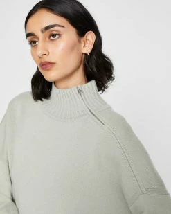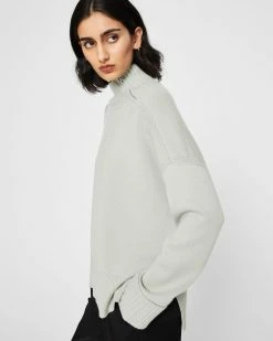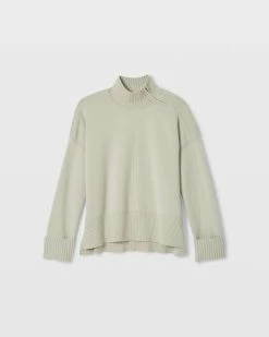 - Rib-knit turtleneck, cuffs, and hem; dropped shoulders; long sleeves; center seam detail; slight high-low hem with side-seam slits