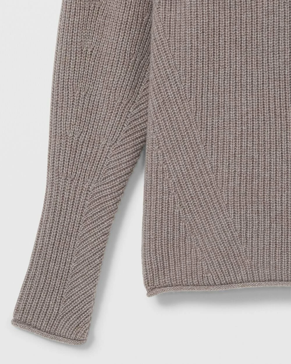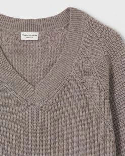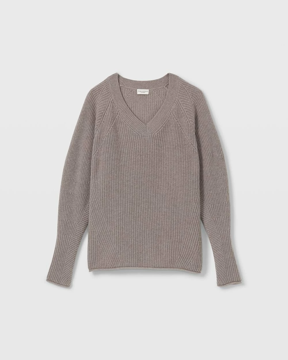- Rib-knit V-neck; mixed-stitch bodice; long sleeves; rolled cuffs and hem