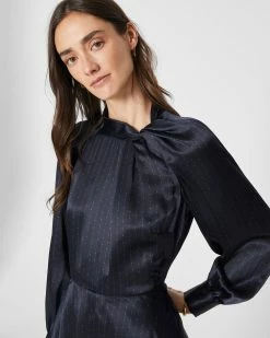- Mock neck with twisted detail; long sleeves; two-button barrel cuffs; darting at bust; natural waistline seam