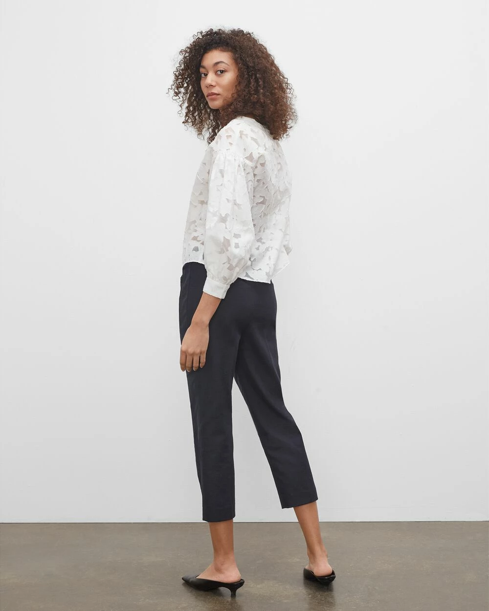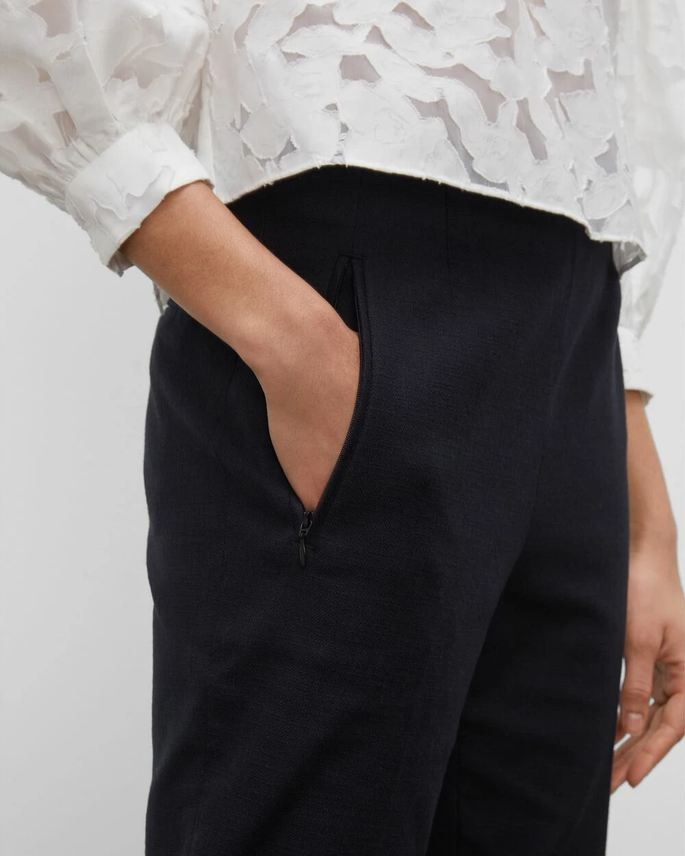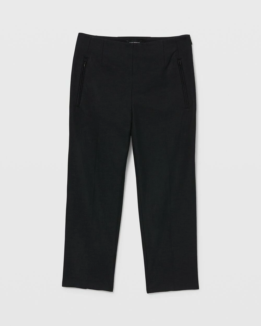 - Designed to sit above the waist with a softly tapered fit and cropped length. Minimally chic.