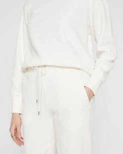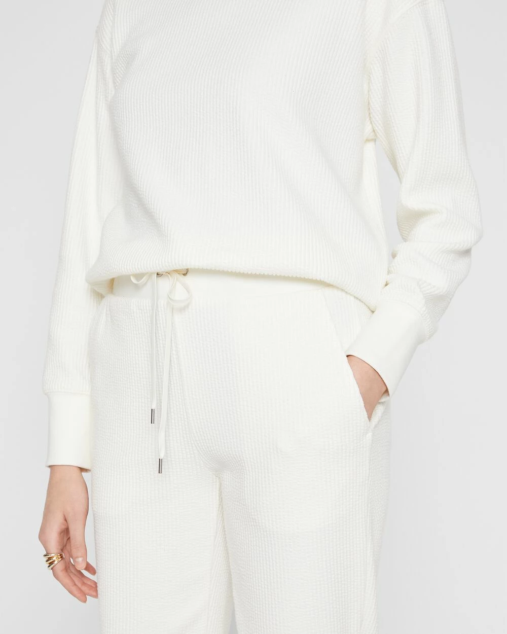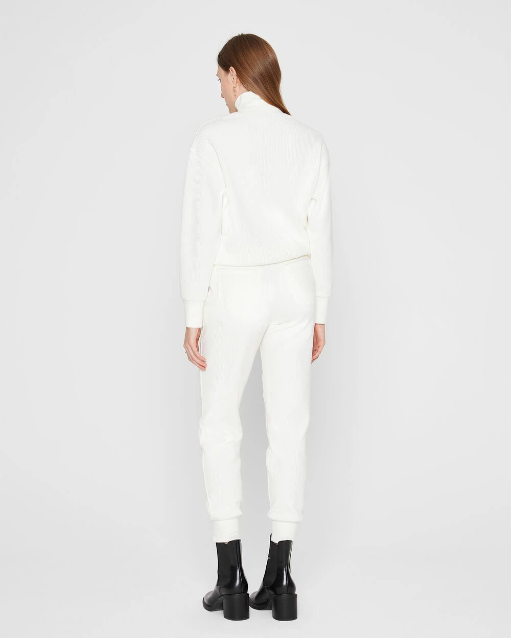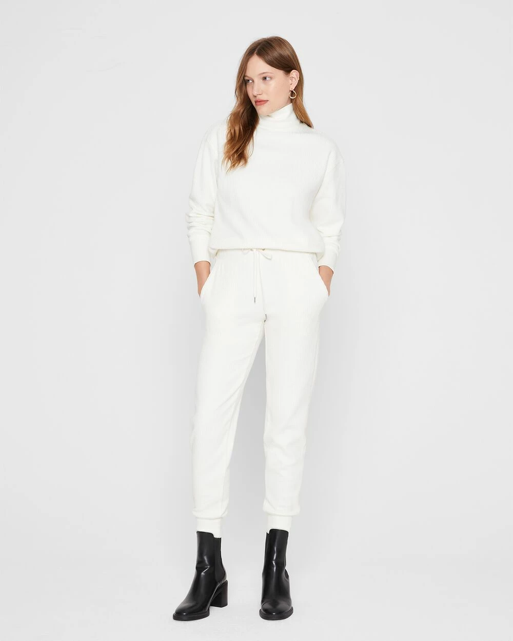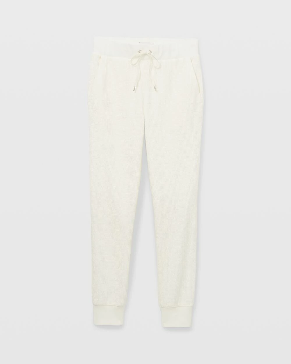 - Cased elastic drawstring waistband; two side pockets; rib-knit cuffs; two back pockets