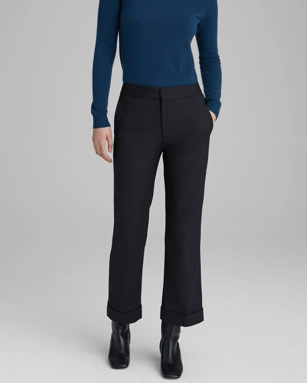 - Set-on waistband; two side pockets; two back pockets; center creasing; sewn-down cuffs