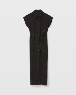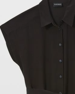 - Point collar; cap sleeves; belt loops; self-sash; back shoulder yoke with inverted pleat; high side-seam slits