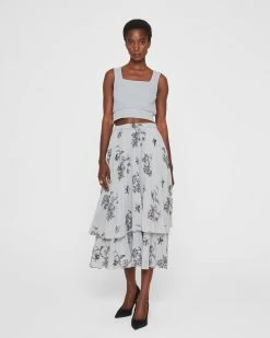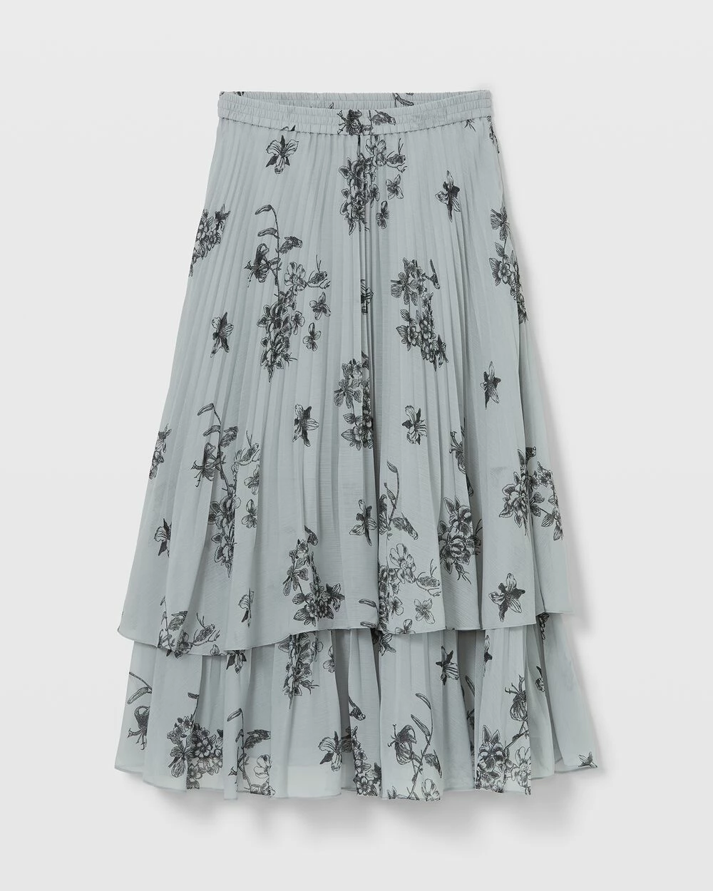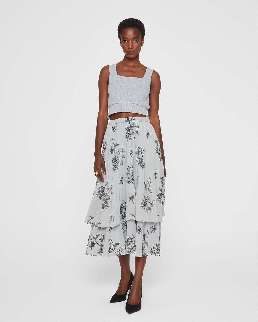 Take the essential staple midi skirt to a new level with a tiered silhouette, pretty print, and crisp pleats. Tuck in a tee for everyday errands, then switch to a blouse for a night out. Made with recycled polyester. By turning industrial waste and post-consumer waste into new product, we are repurposing plastic and reducing our dependence on virgin petroleum-based materials.