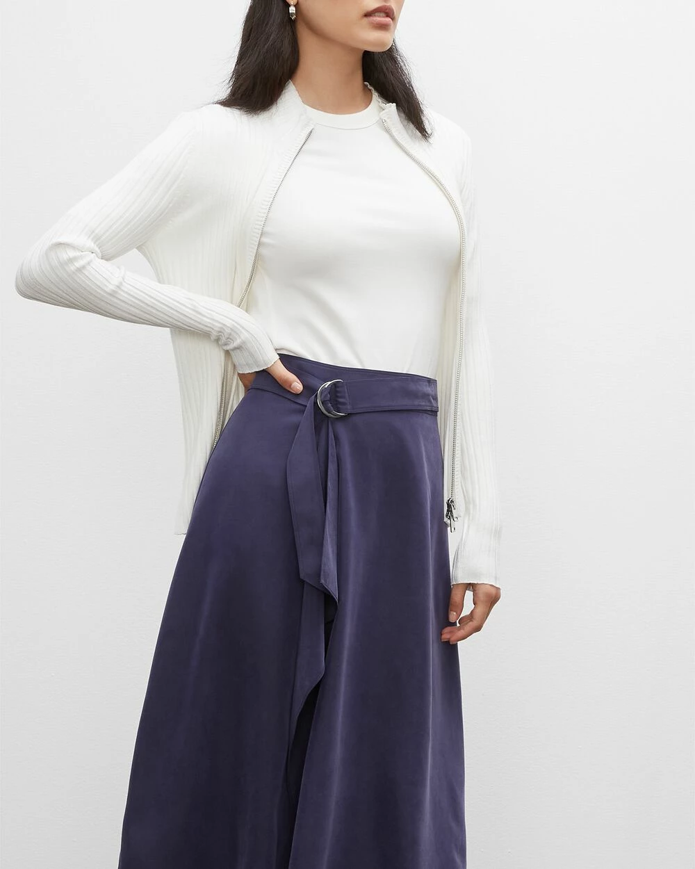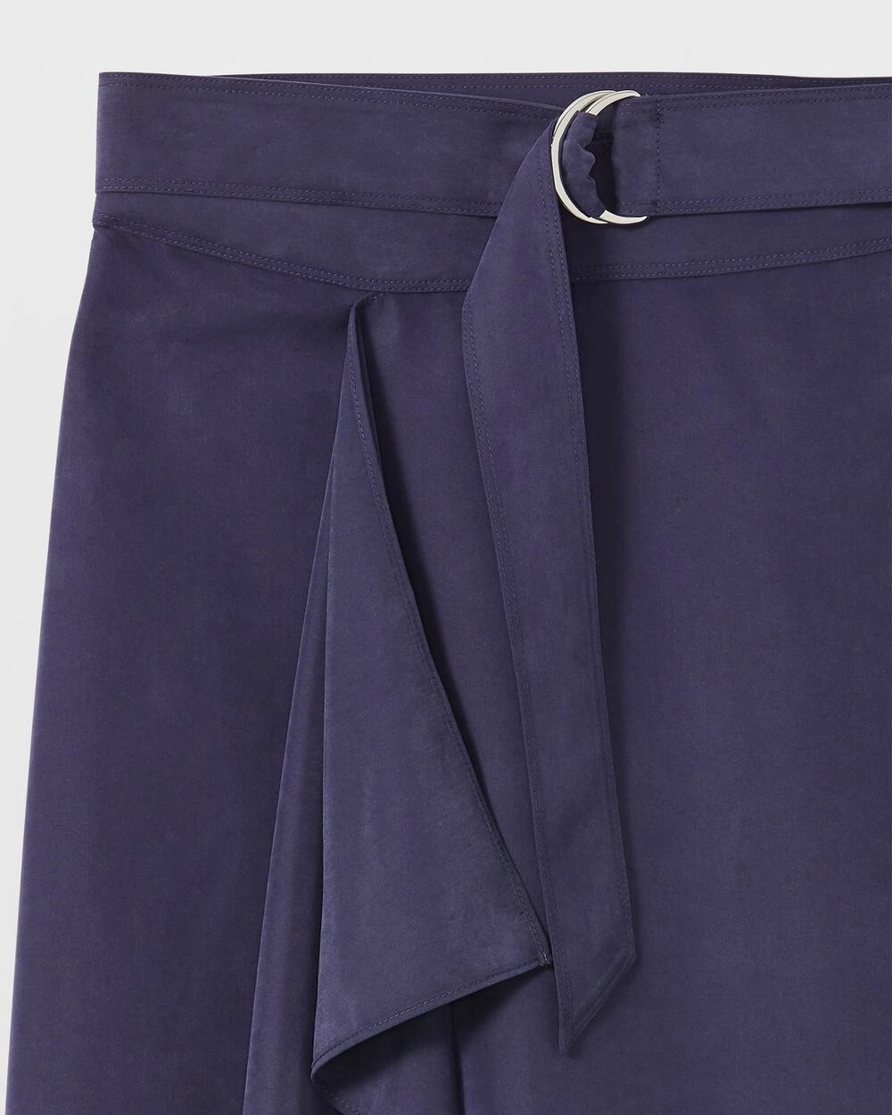 - Set-on waistband; removable D-ring self-belt; front drape detail; side-seam slits