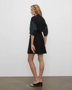 - Concealed side zip closure; belted waist