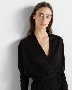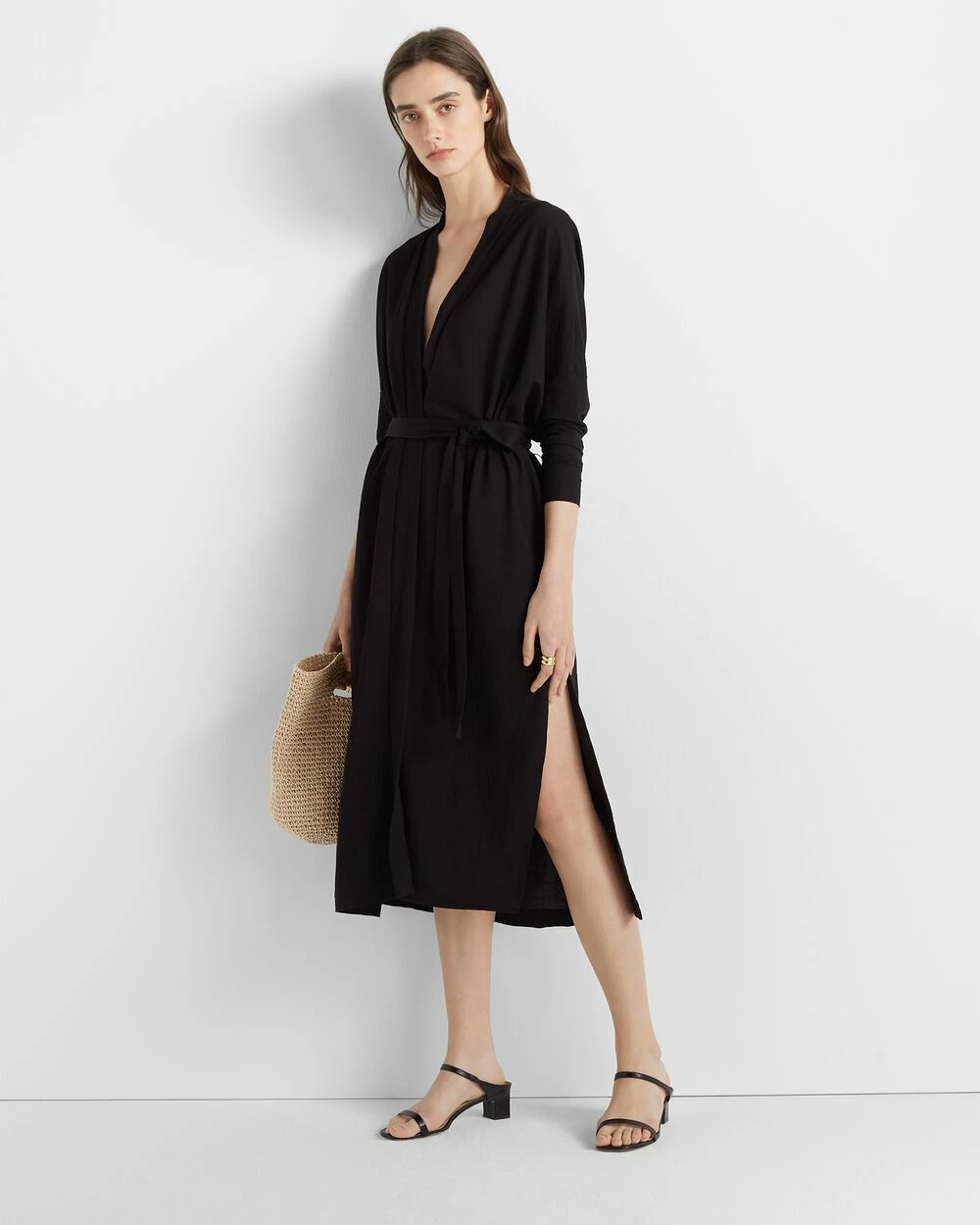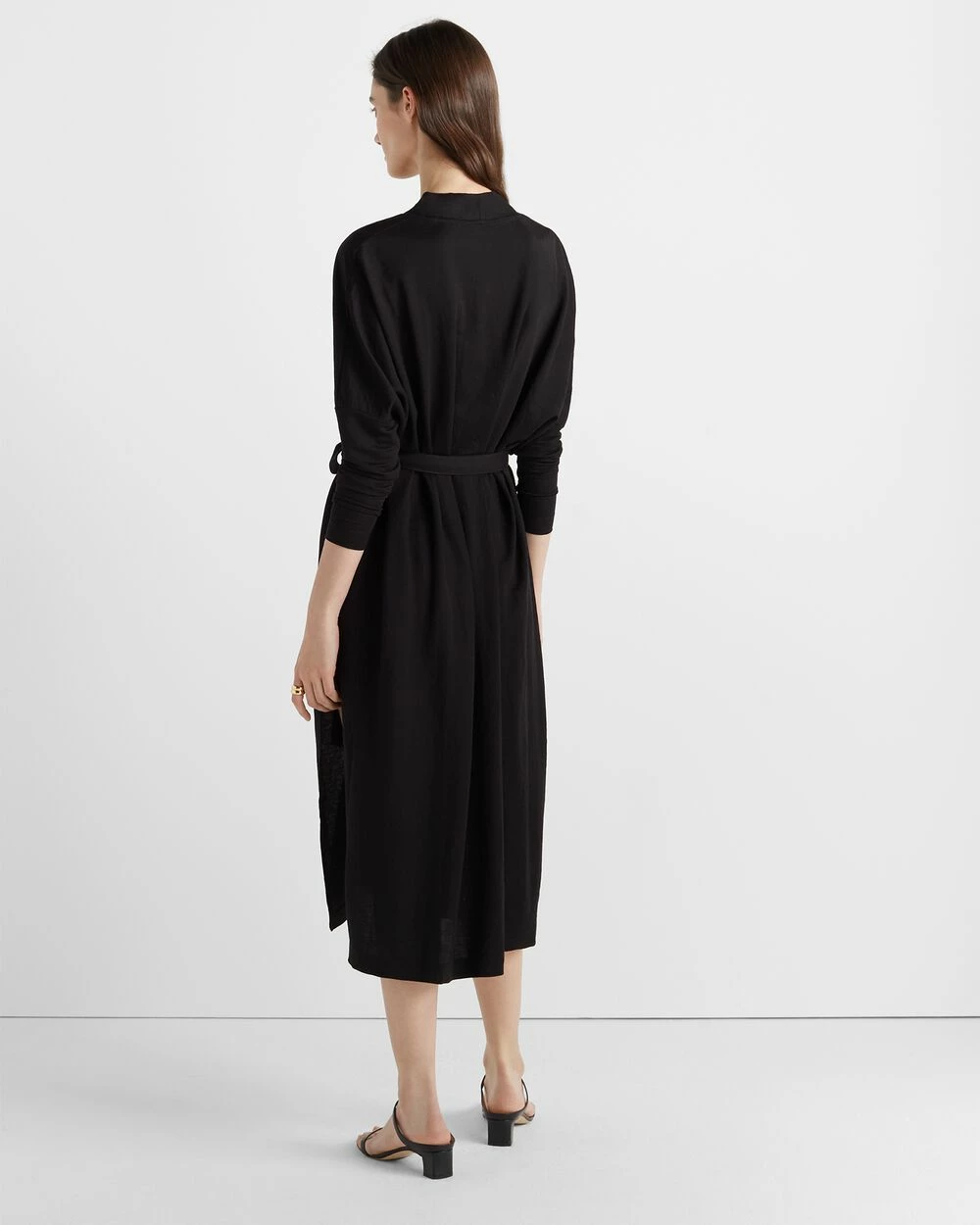 - Open front; self-tie sash at waist; dressmaker loops at sides; slits at sides of hem; drop-shoulder long sleeves