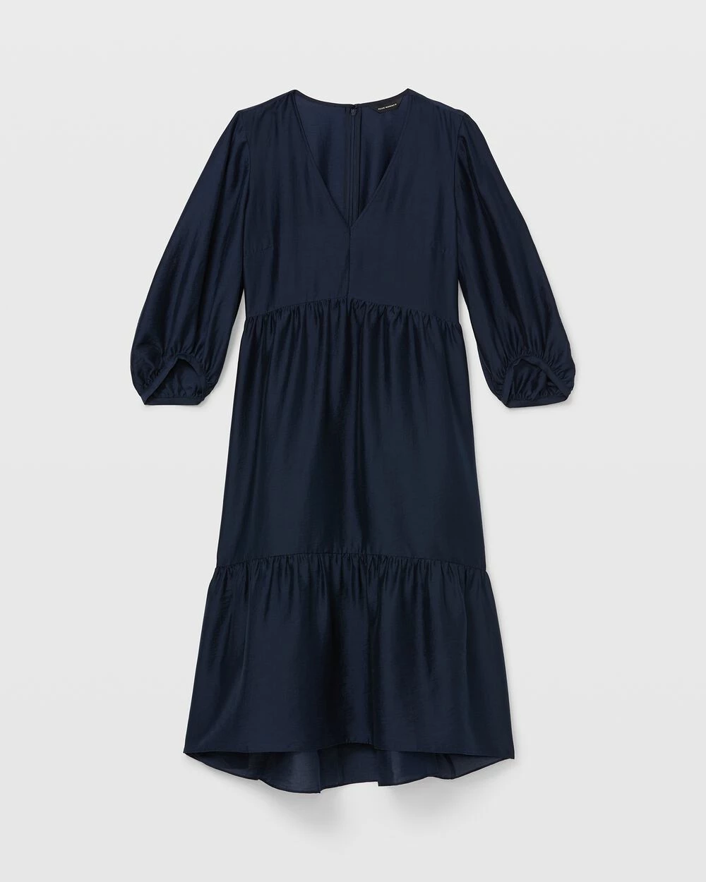 - V-neck; three-quarter-length blouson sleeves; darting at bust; tiered skirt