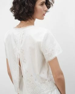 - Round neck; short sleeves; crossover open back; scalloped hem; allover embroidered eyelet detail