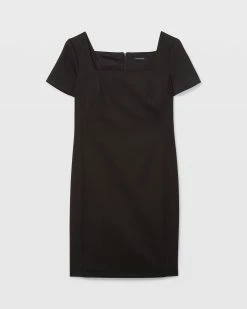 Despite its namesake, this midi dress is anything but square. The geometric neckline and fitted silhouette are equal parts elegant and edgy. Perfect for work days or under a chic moto jacket for nights and weekends. Made with recycled polyester. By turning industrial waste and post-consumer waste into new product, we are repurposing plastic and reducing our dependence on virgin petroleum-based materials.