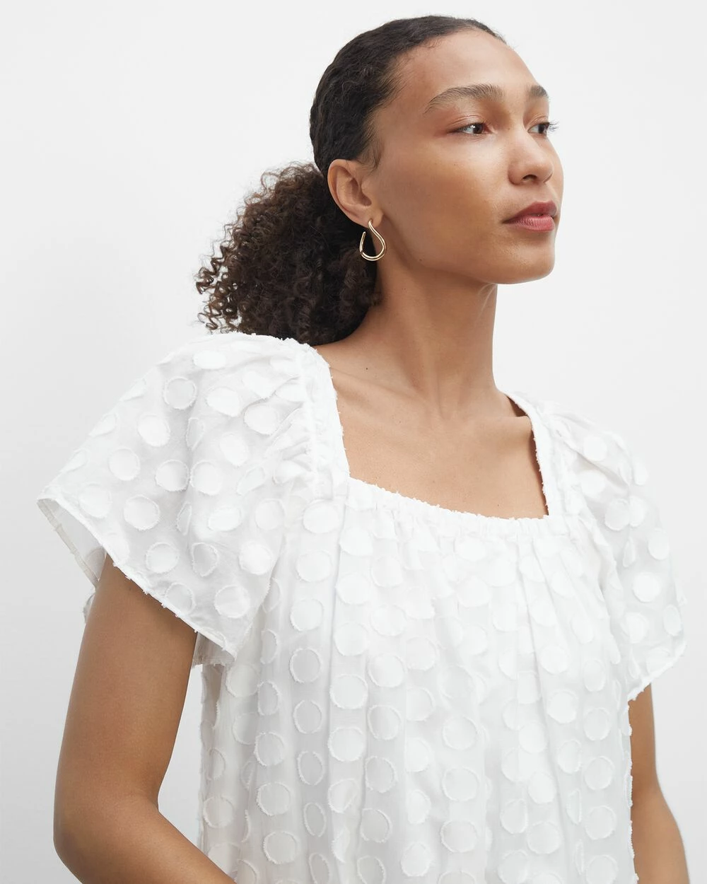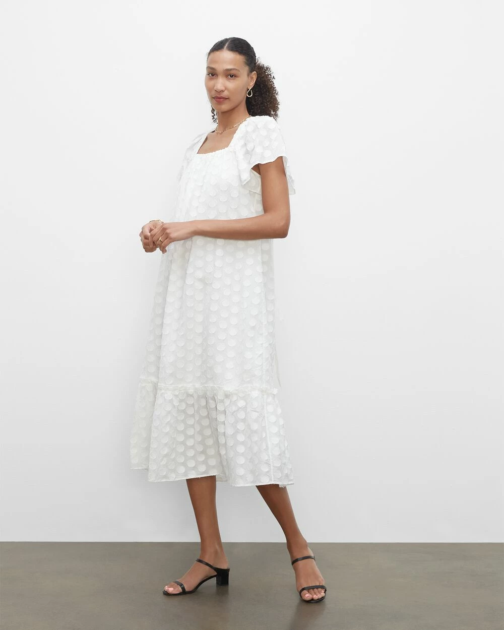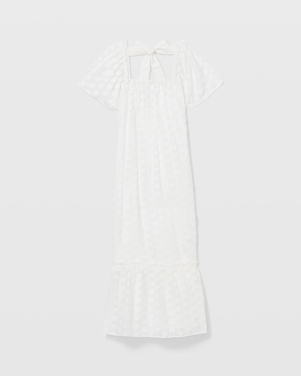 - Square neck; short flutter sleeves; tiered hem