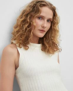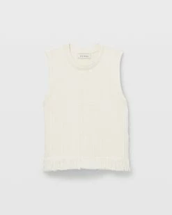- Rib-knit crewneck and armholes; sleeveless; straight hem with fringe trim