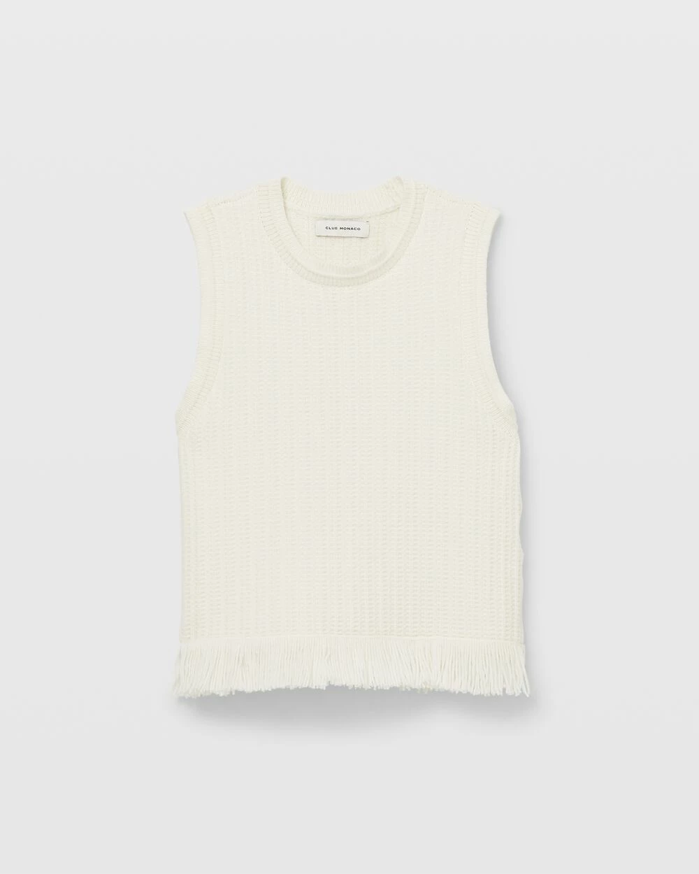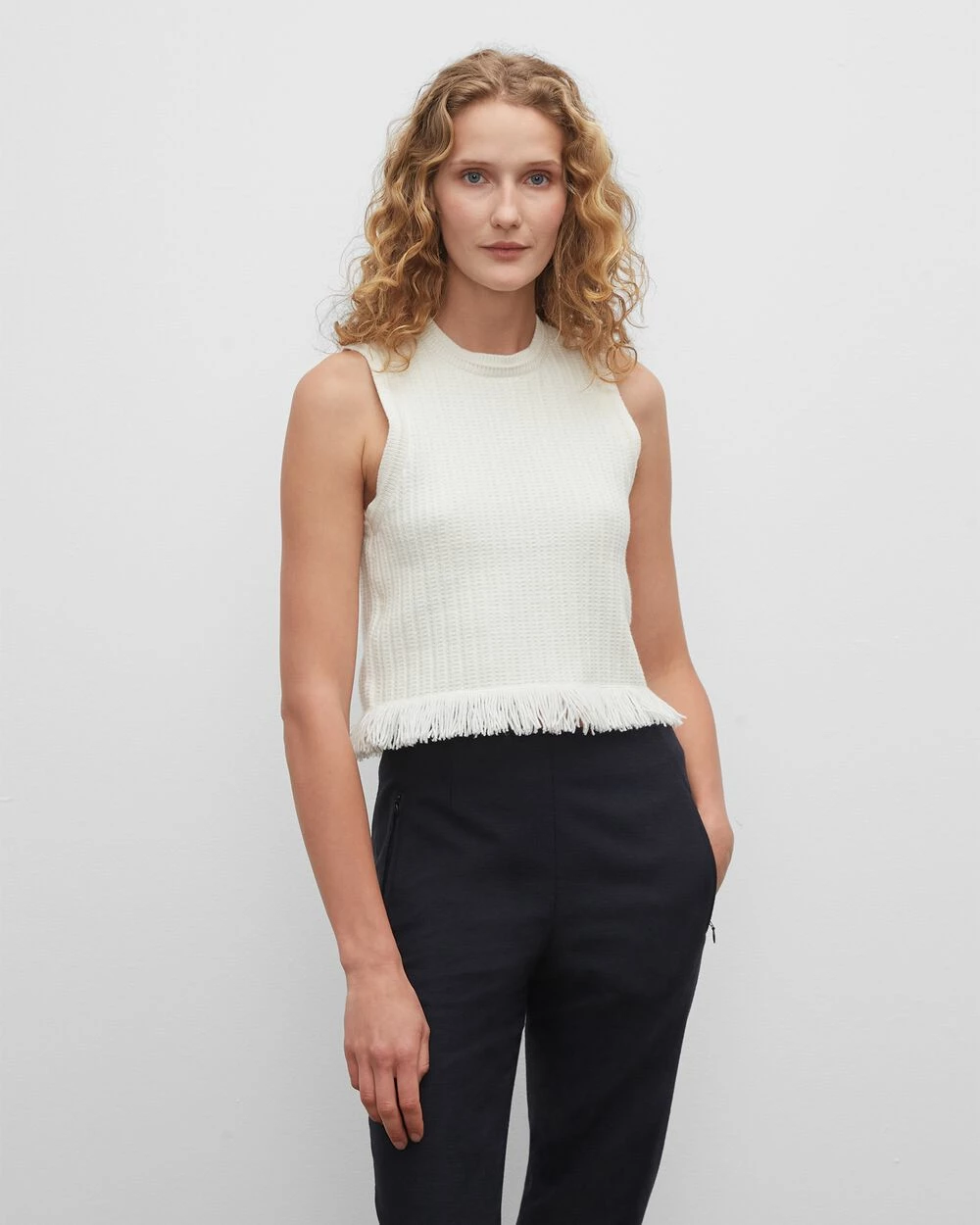 Fringe is back. This tank is knit from a textural cotton blend with a playful fringe trim at the hem. Stylish and sleek, it looks just as good over your favorite jeans as it does with tailored pants.