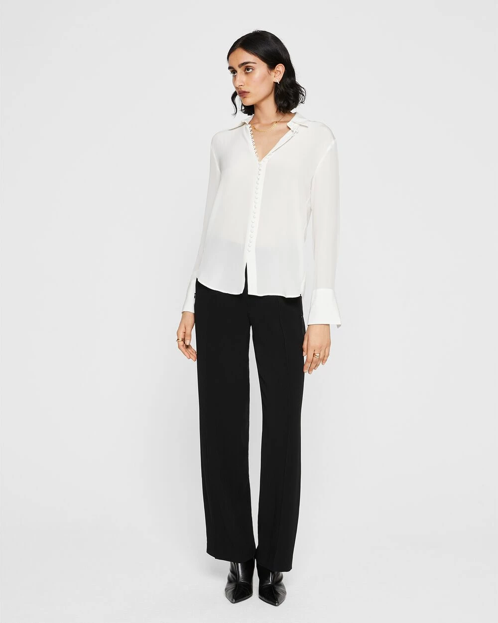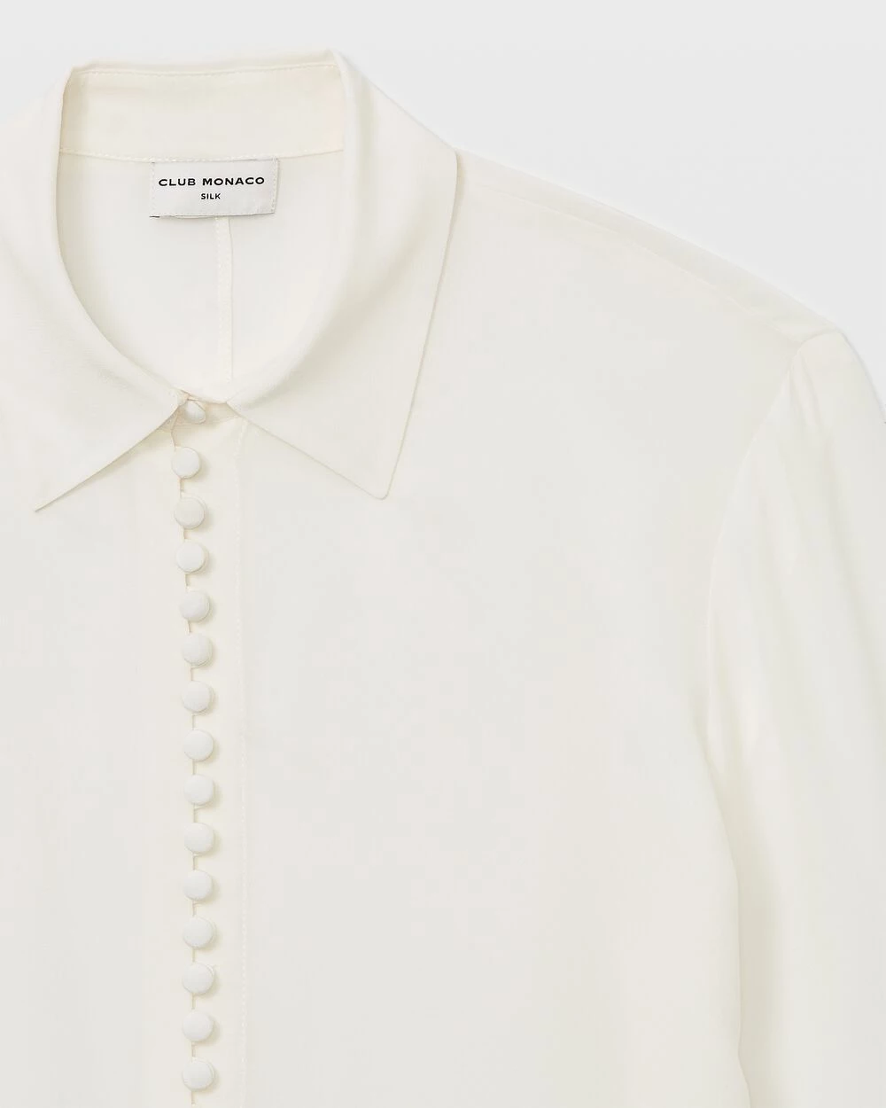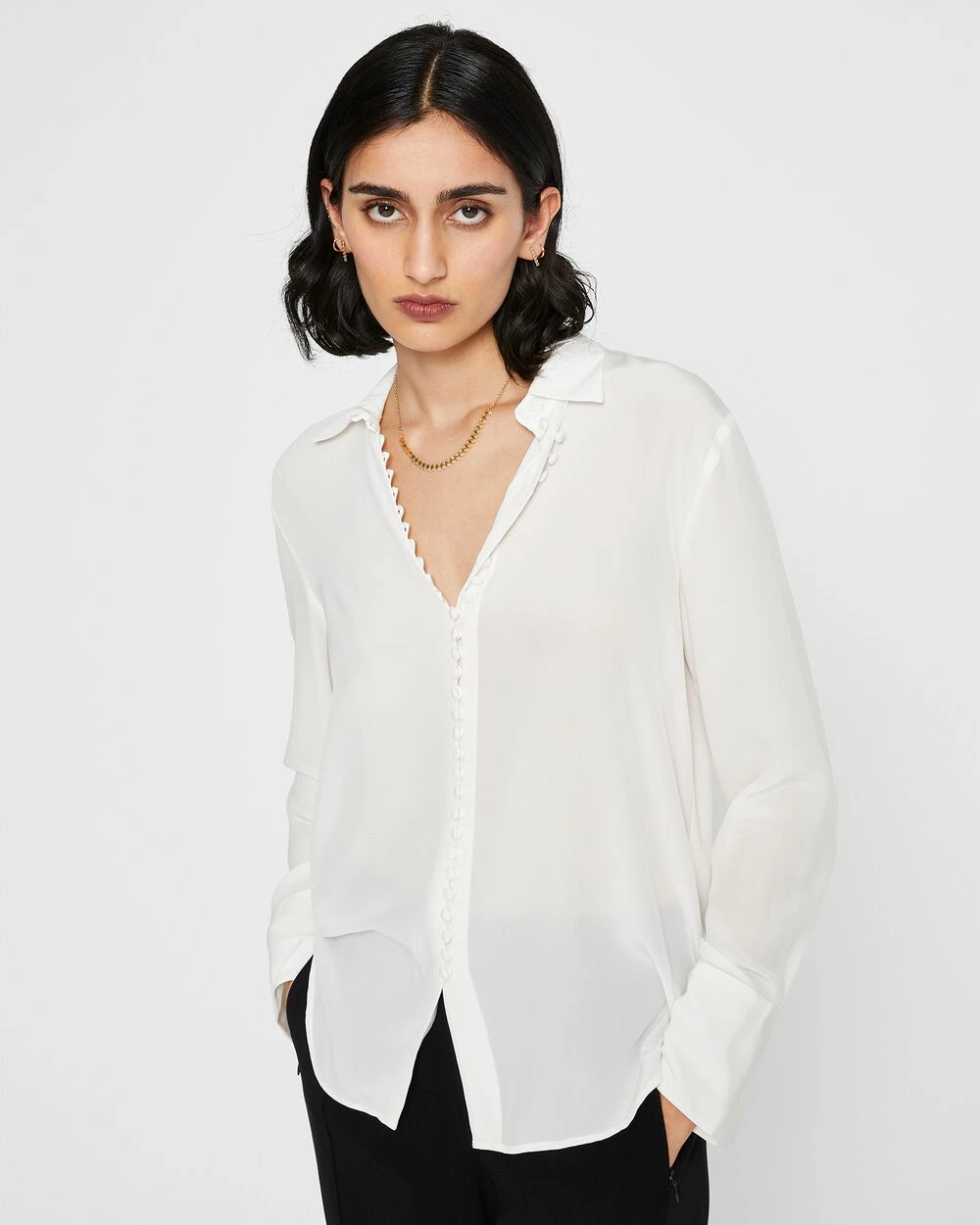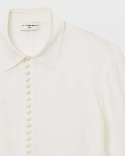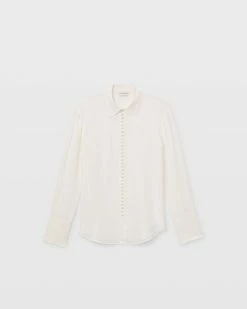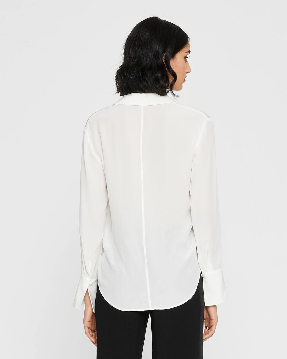 Detail oriented. Split cuffs and self-covered buttons add style to the luxe silk crΓͺpe de Chine Helek shirt. The perfect top to dress up your off-hours denim.