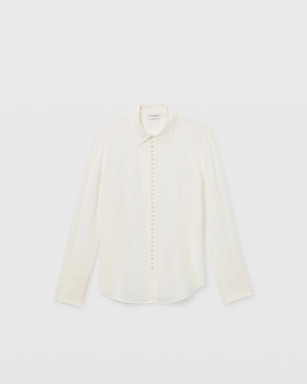 - Point collar; long sleeves; single-button split barrel cuffs; shirttail hem; self-covered buttons