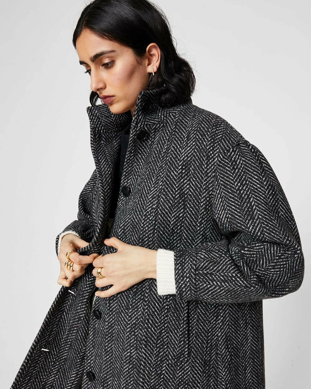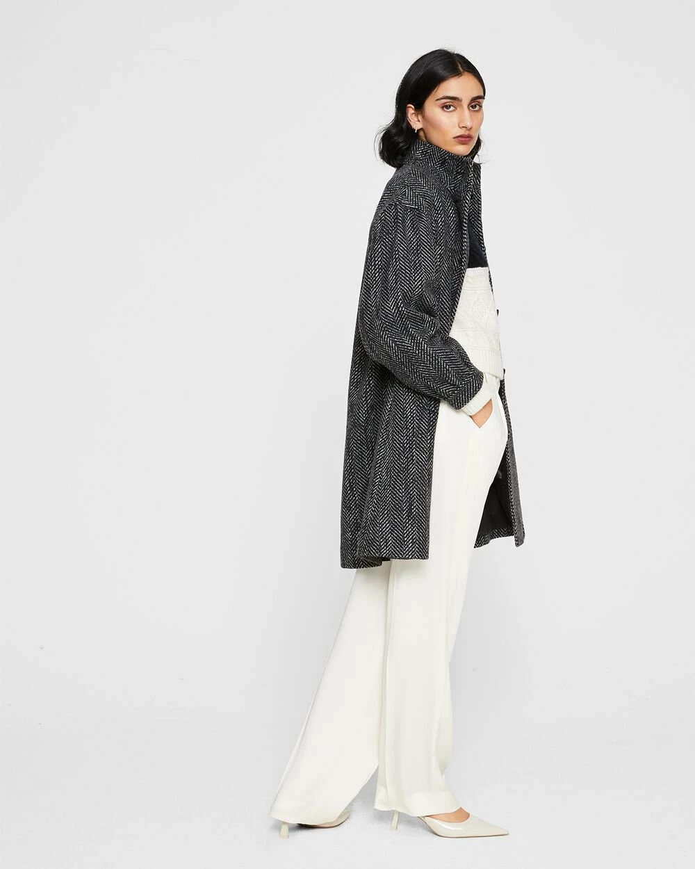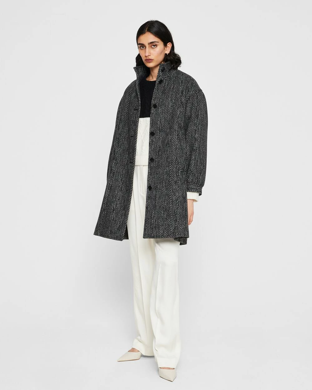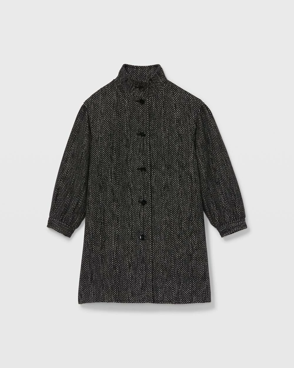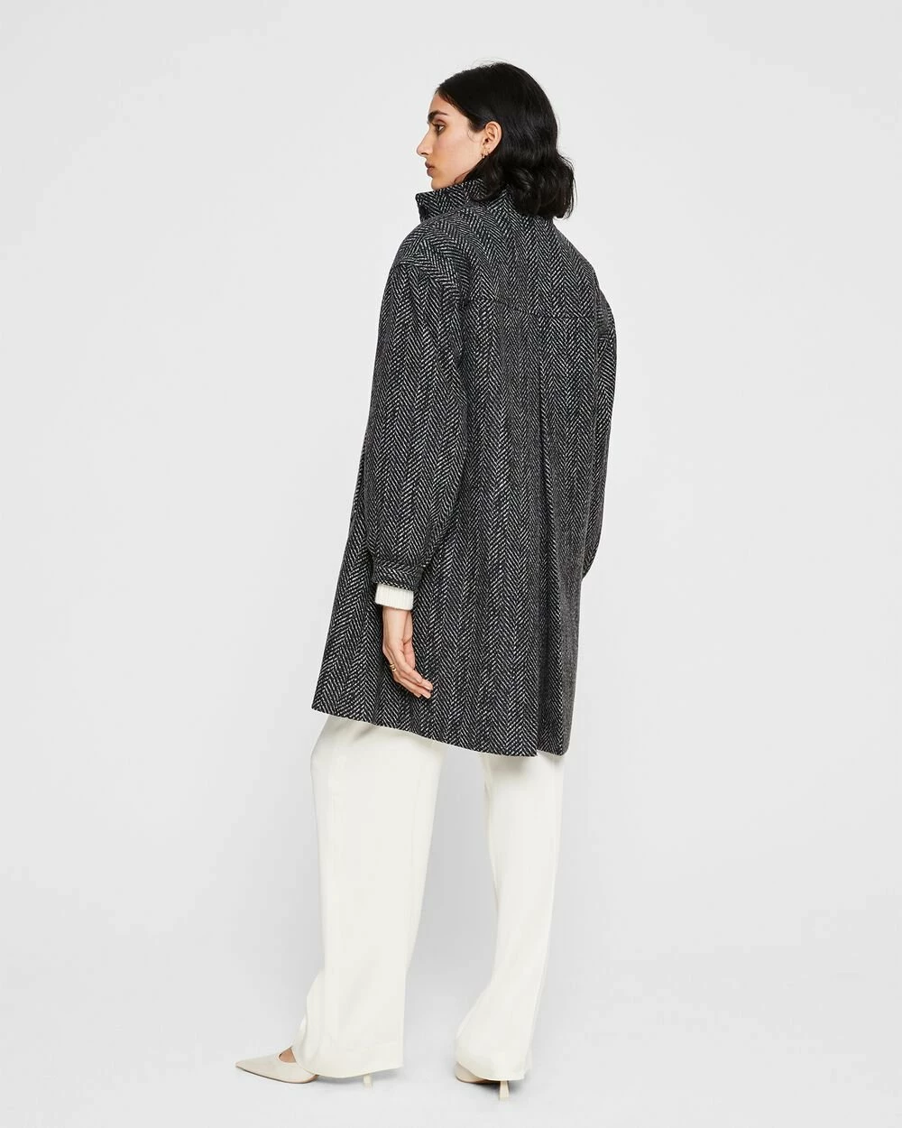 A traditional herringbone-weave coat reinvented for right now with a playful swing silhouette and a high neckline. Cleverly cut in a way that allows room for underlayers.