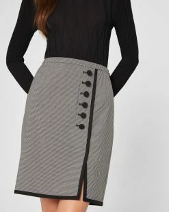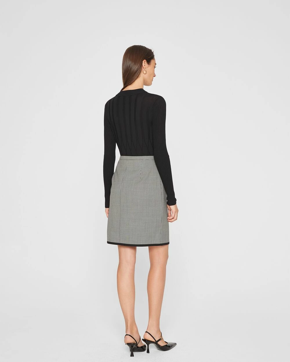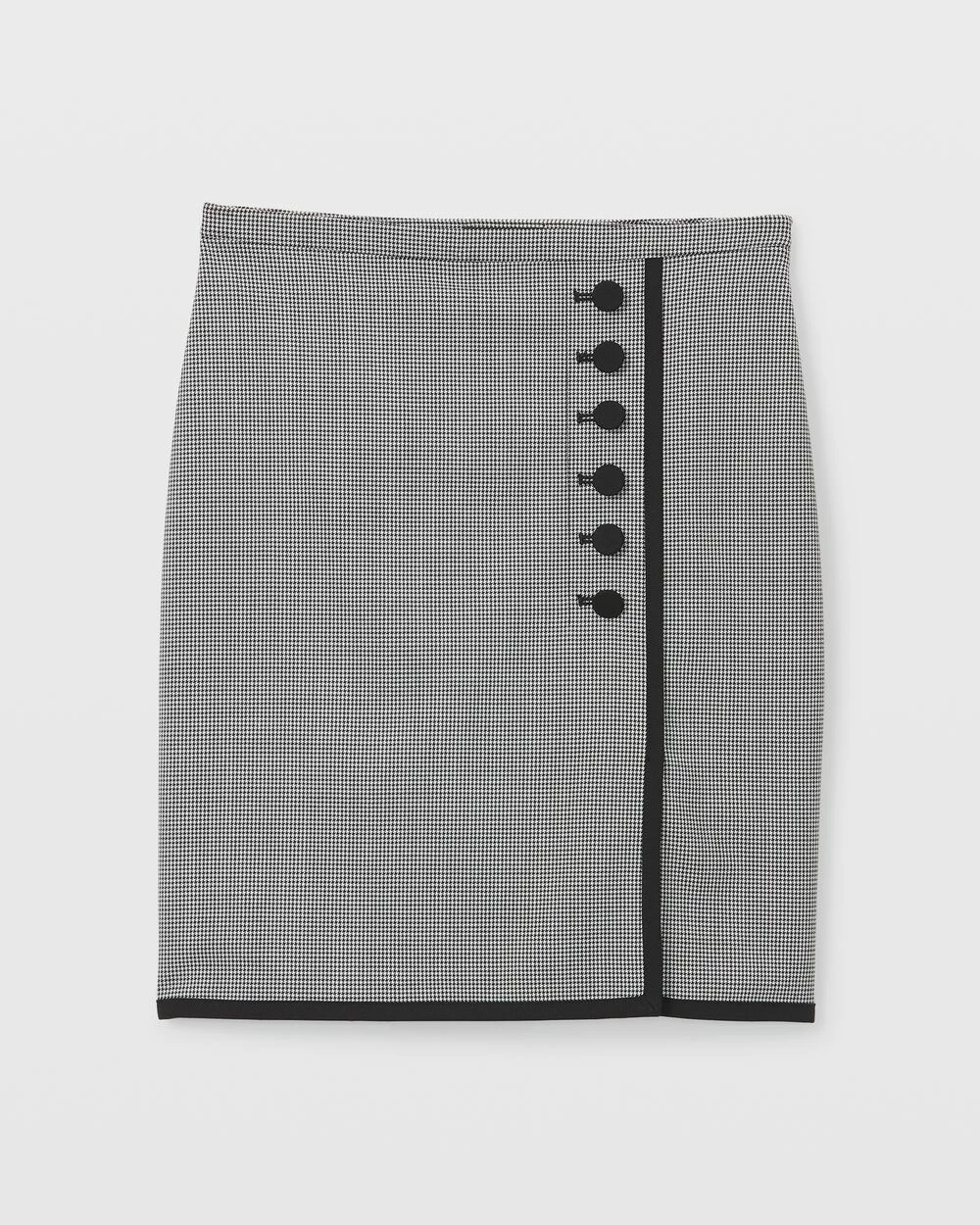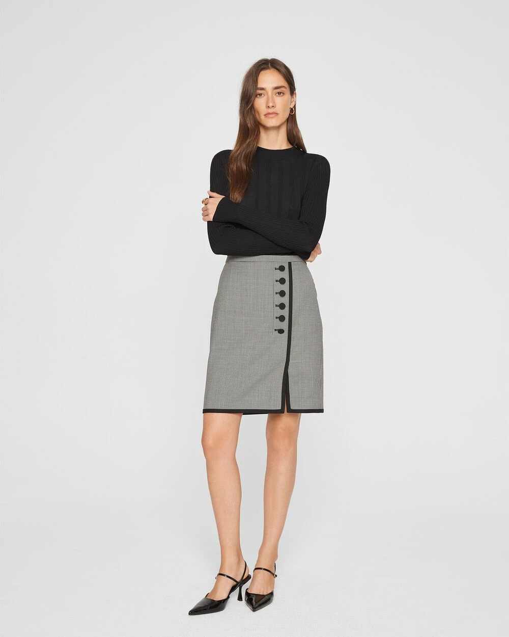 A row of pretty buttons decorates this stretch wool-blend pencil skirt. Lined with recycled polyester. By turning industrial waste and post-consumer waste into new product, we are repurposing plastic and reducing our dependence on virgin petroleum-based materials.