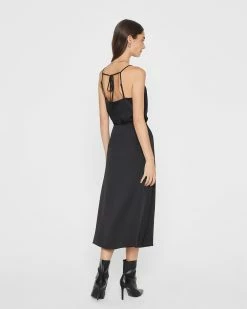 - Narrow set-on waistband; decorative placket with self-covered buttons; straight hem with side slit