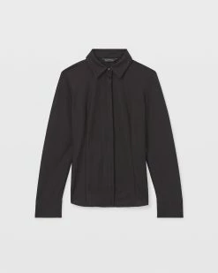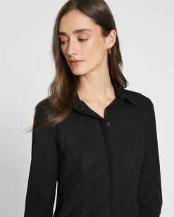 - Spread collar; front vertical darting; long sleeves; single-button barrel cuffs; shoulder yoke and vertical darting at back