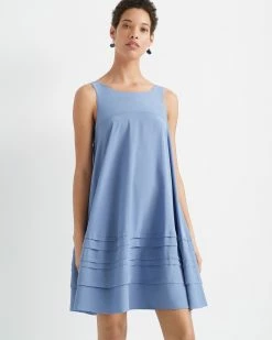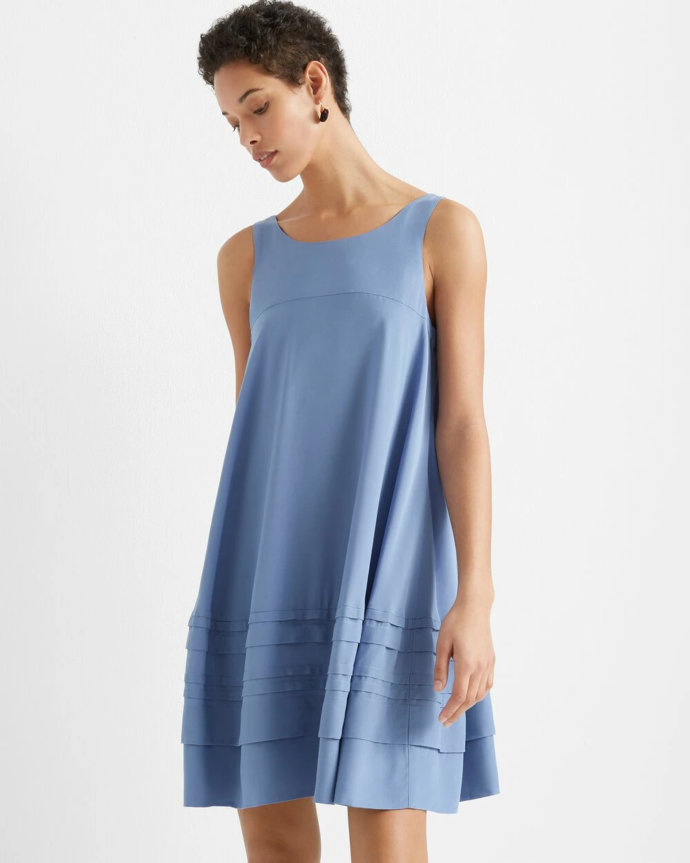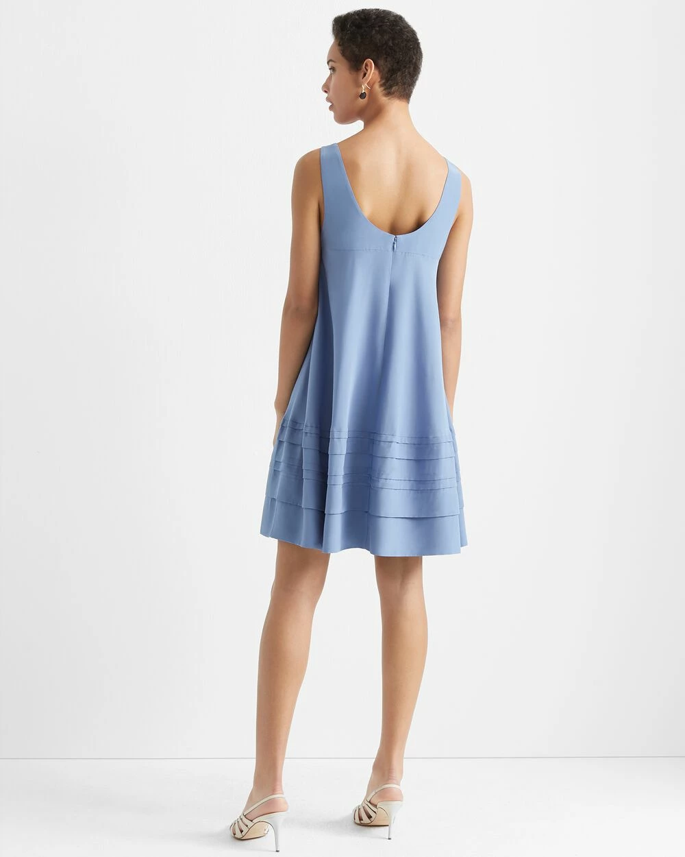 - Scoop neck; concealed back zip; seamed at front and back yoke; tucked pleats at hem