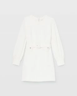 - Round neck; front and back shoulder yoke; long sleeves; two-button barrel cuffs; self-belted waist with square buckle; snap-down belt loops; two side pockets