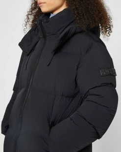 - Water-resistant shell; drawstring hood; stand collar; drawstring waist; two side pockets; long sleeves; logo patch at left sleeve; allover channel quilting