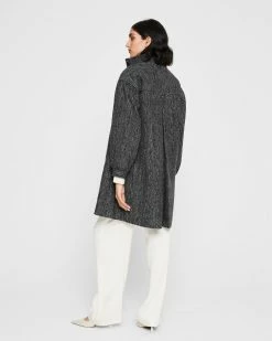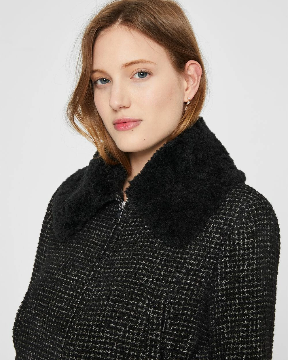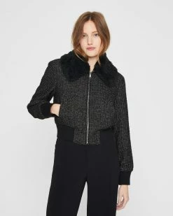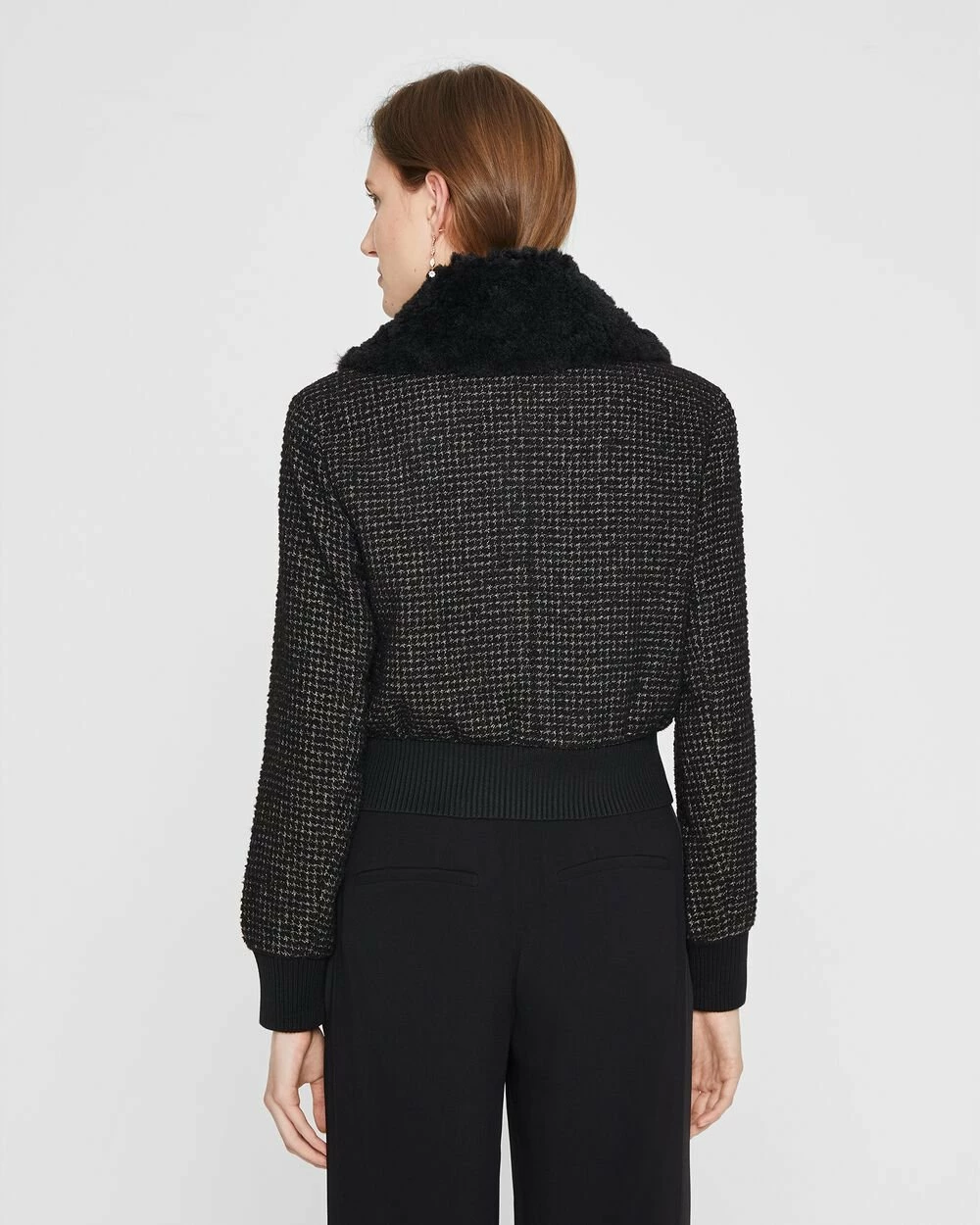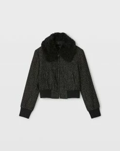 We took a boxy bomber-style jacket and updated it with a tweedy fabrication and button-off faux-fur collar for a little warmth and a lot of flair.