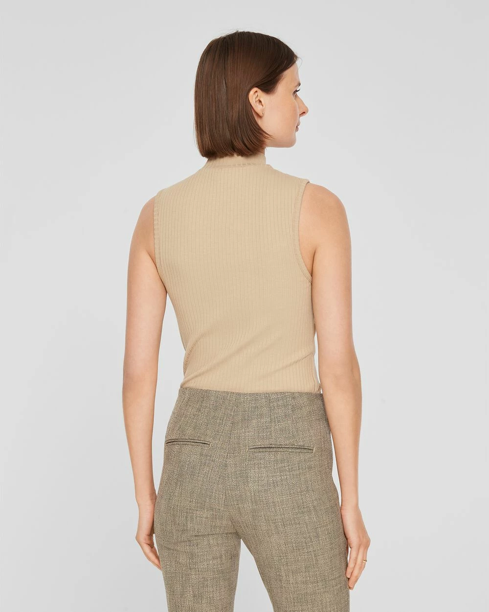 Dressing in between seasons calls for balance. A sleeveless tank top with a mock neckline and a stretchy knit works now and later. Tuck it into our Tab Detail Pants for a polished finish.